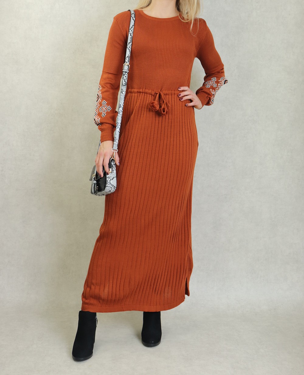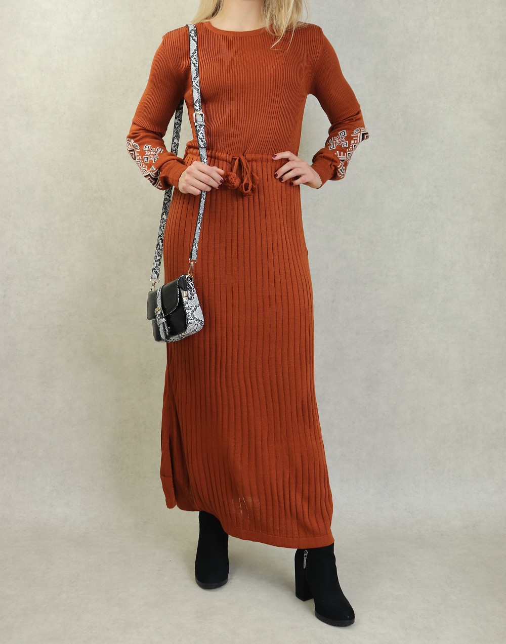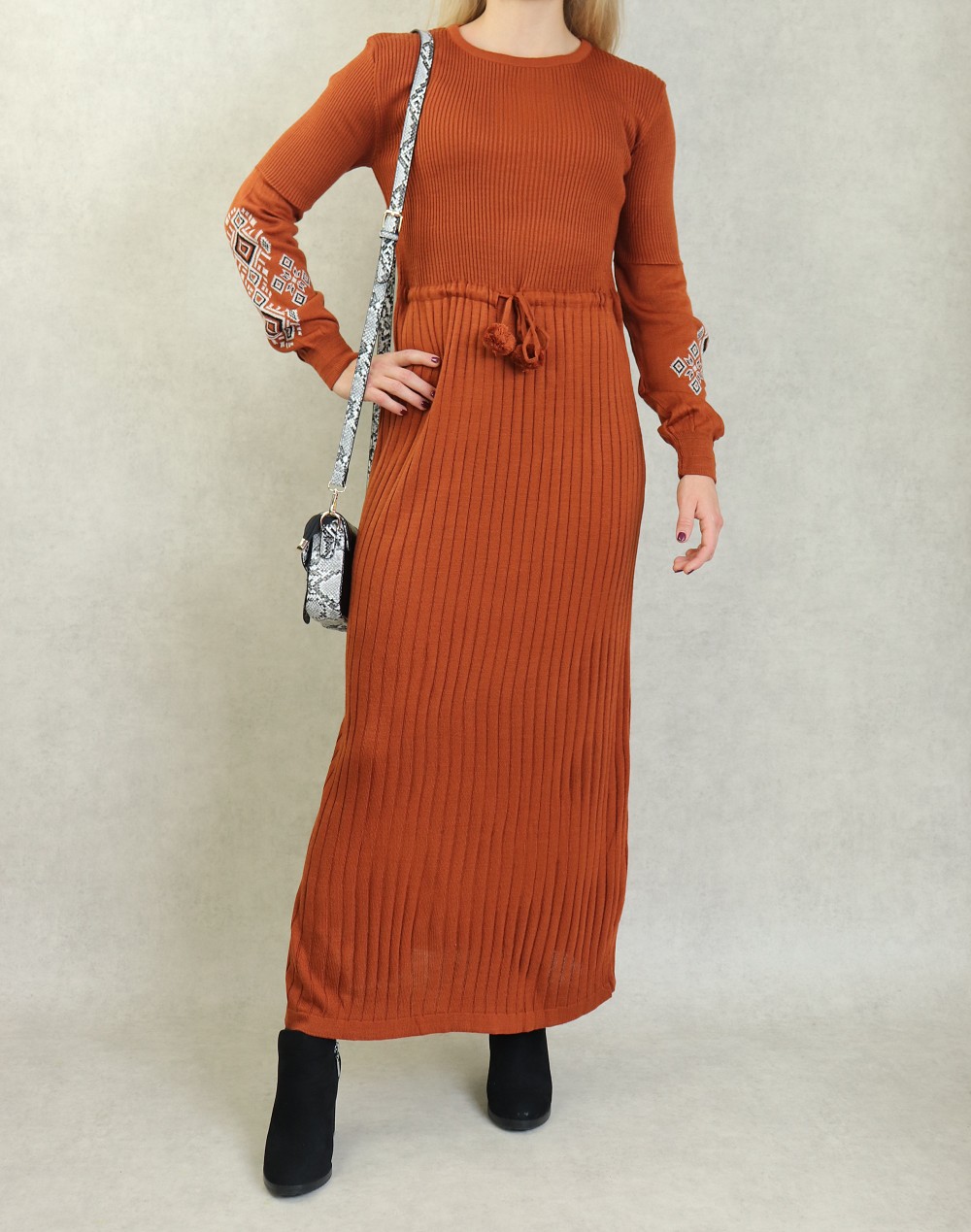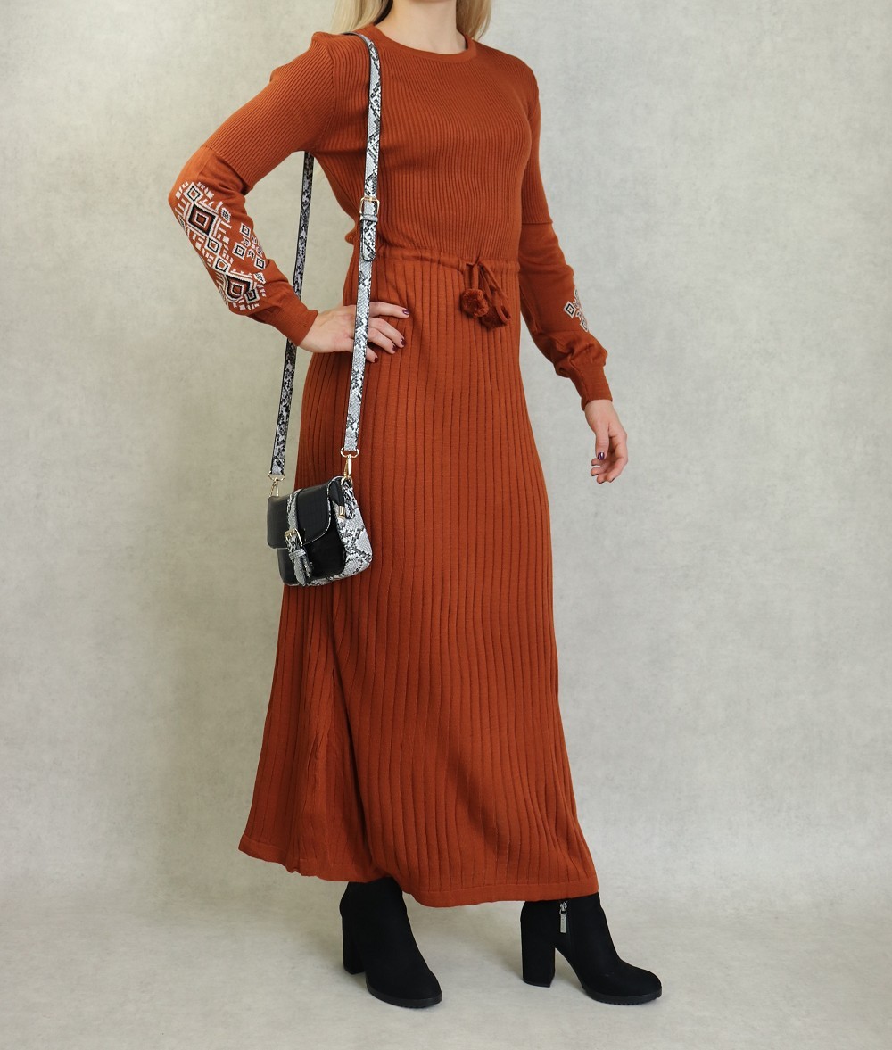 Robe originale, elle mettra en valeur votre côté chic et féminin. Encolure rond. Manches longues avec motif brodé sur l'avant bras. Découpe taille avec un lien de serrage. Facile à vivre, douce sur la peau et bien souple, la robe pull en côtes.