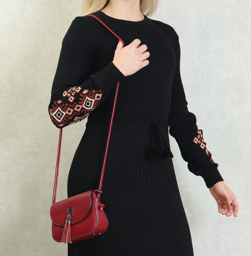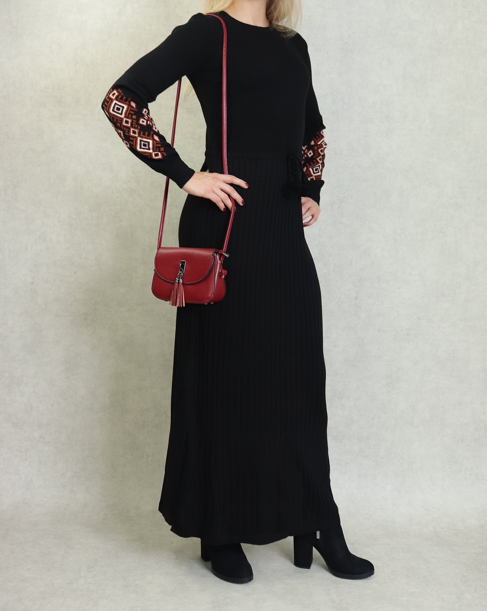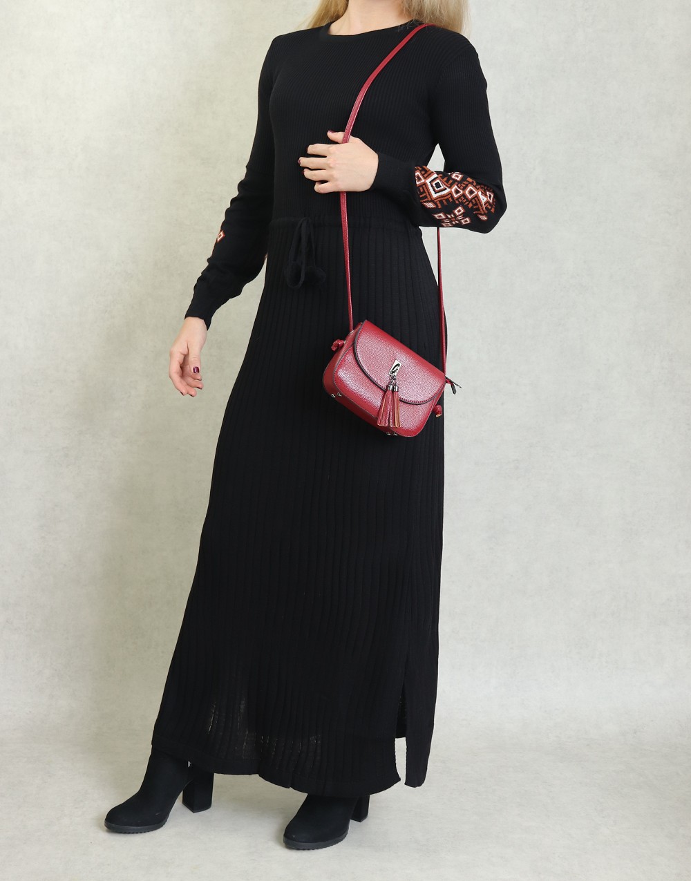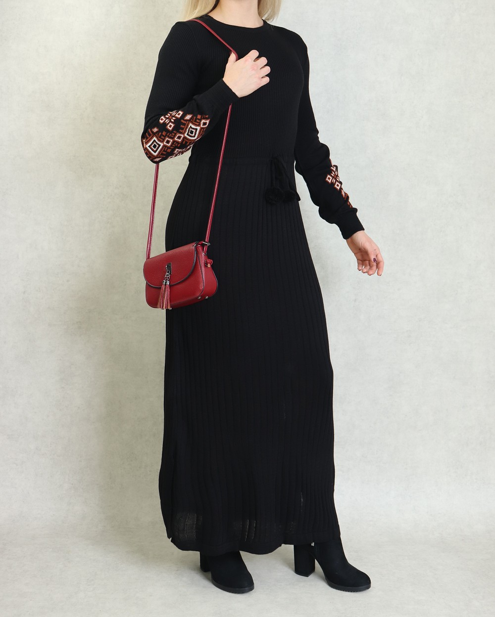 Robe originale, elle mettra en valeur votre côté chic et féminin. Encolure rond. Manches longues avec motif brodé sur l'avant bras. Découpe taille avec un lien de serrage (ceinture intégrée à pompon). Facile à vivre, douce sur la peau et bien souple, la robe pull en côtes.
