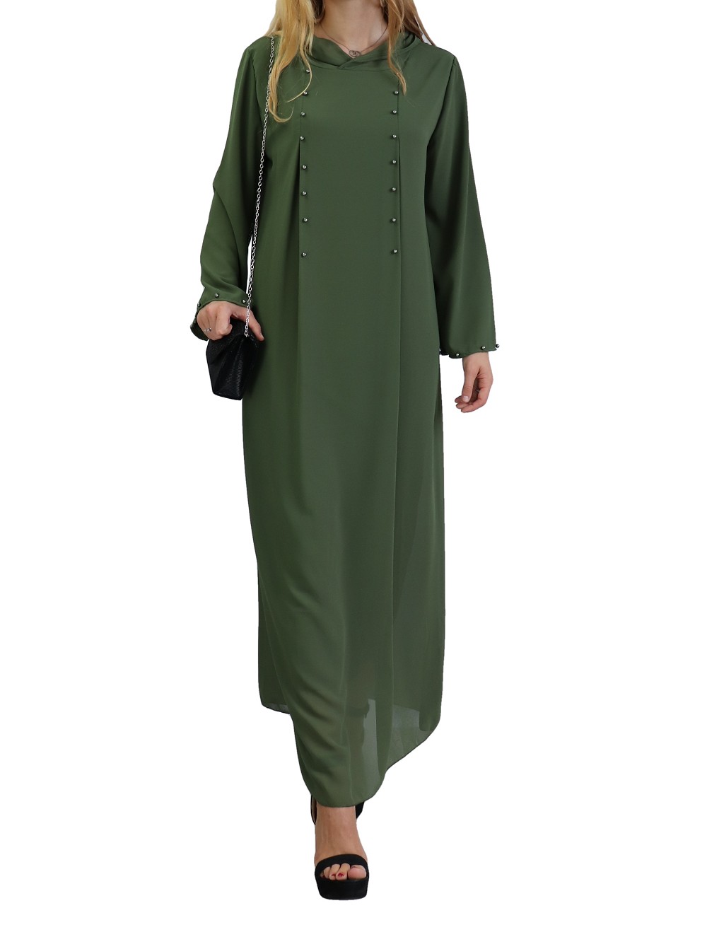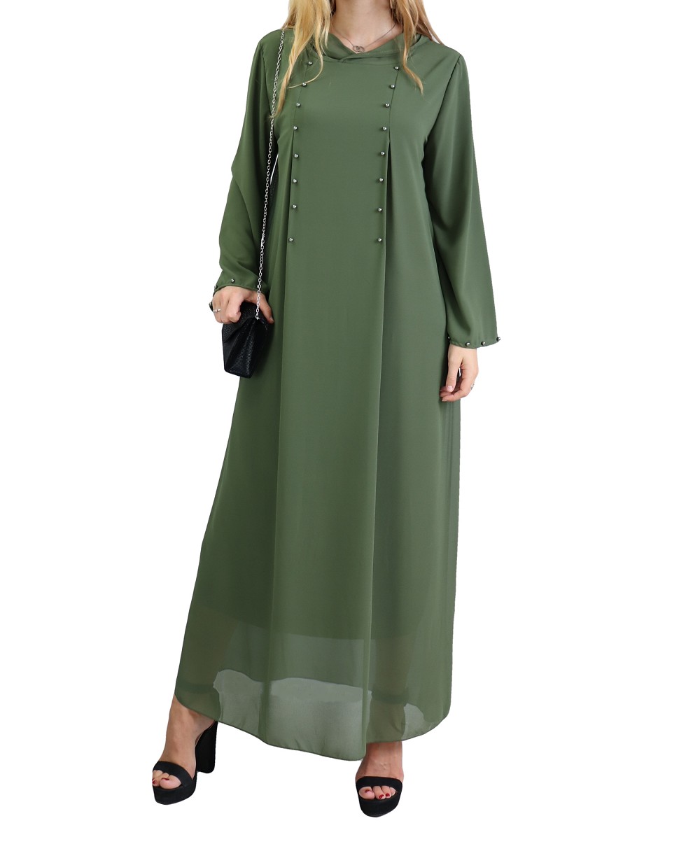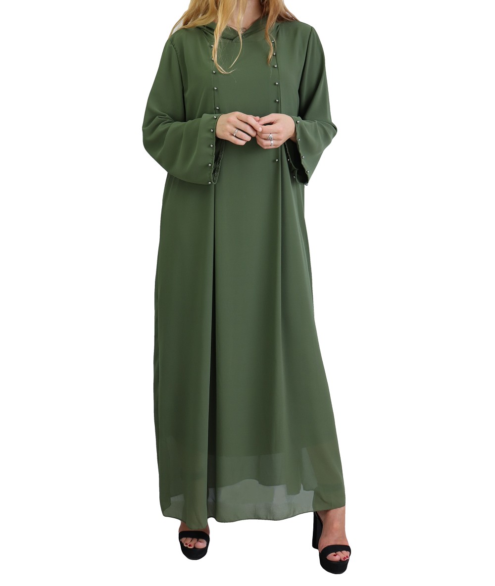 Robe longue, col capuche, entièrement doublée, manches longues, orné des perles sur le devant ainsi que les poignets. Sobre et élégant, Cette tenue s’accommode pour diverses occasions aussi bien festives que quotidiennes.