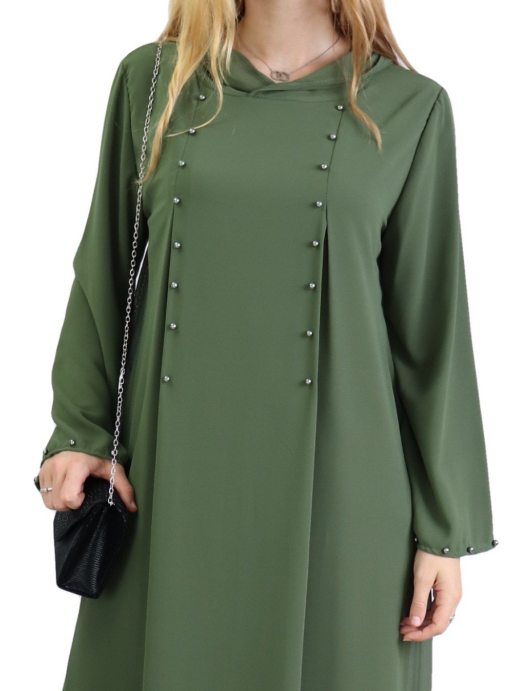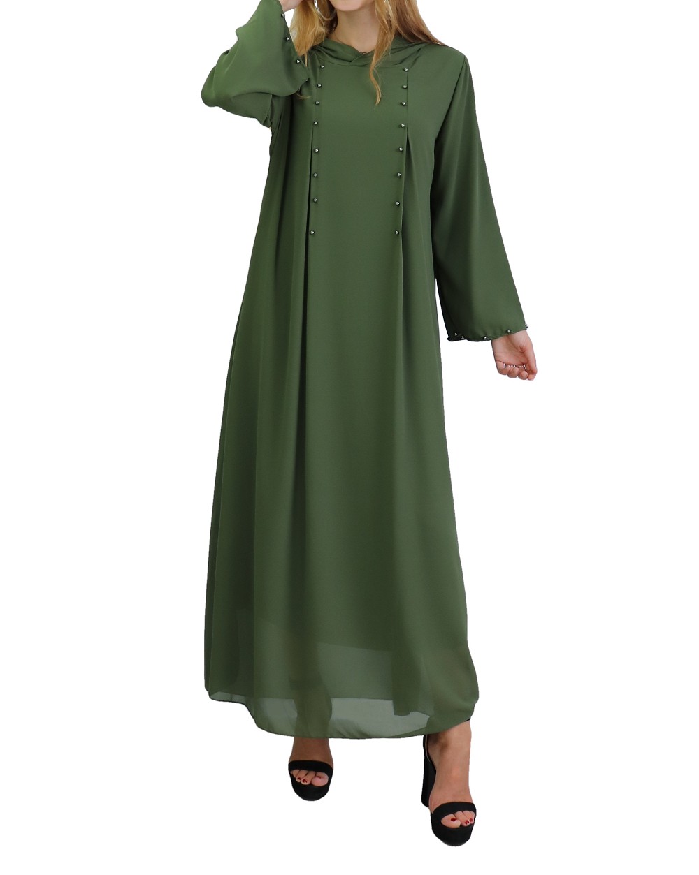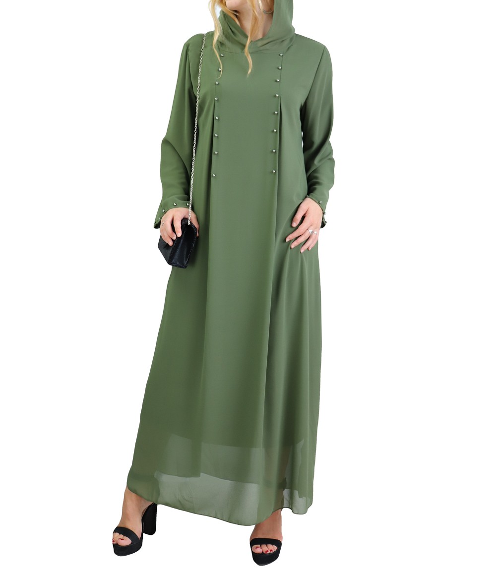 Robe longue, col capuche, entièrement doublée, manches longues, orné des perles sur le devant ainsi que les poignets. Sobre et élégant, Cette tenue s’accommode pour diverses occasions aussi bien festives que quotidiennes.