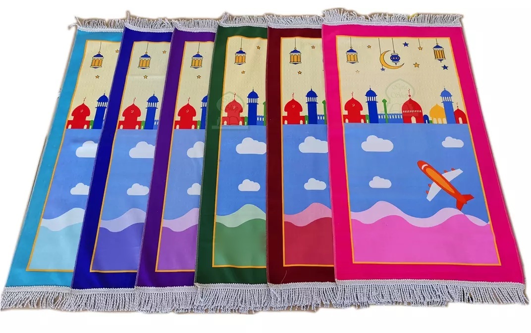 Tapis de priere (Sajjadat-Salat) pour enfants et ados musulmans avec dessin Mosquee et Avion (Plusieurs couleurs disponibles)