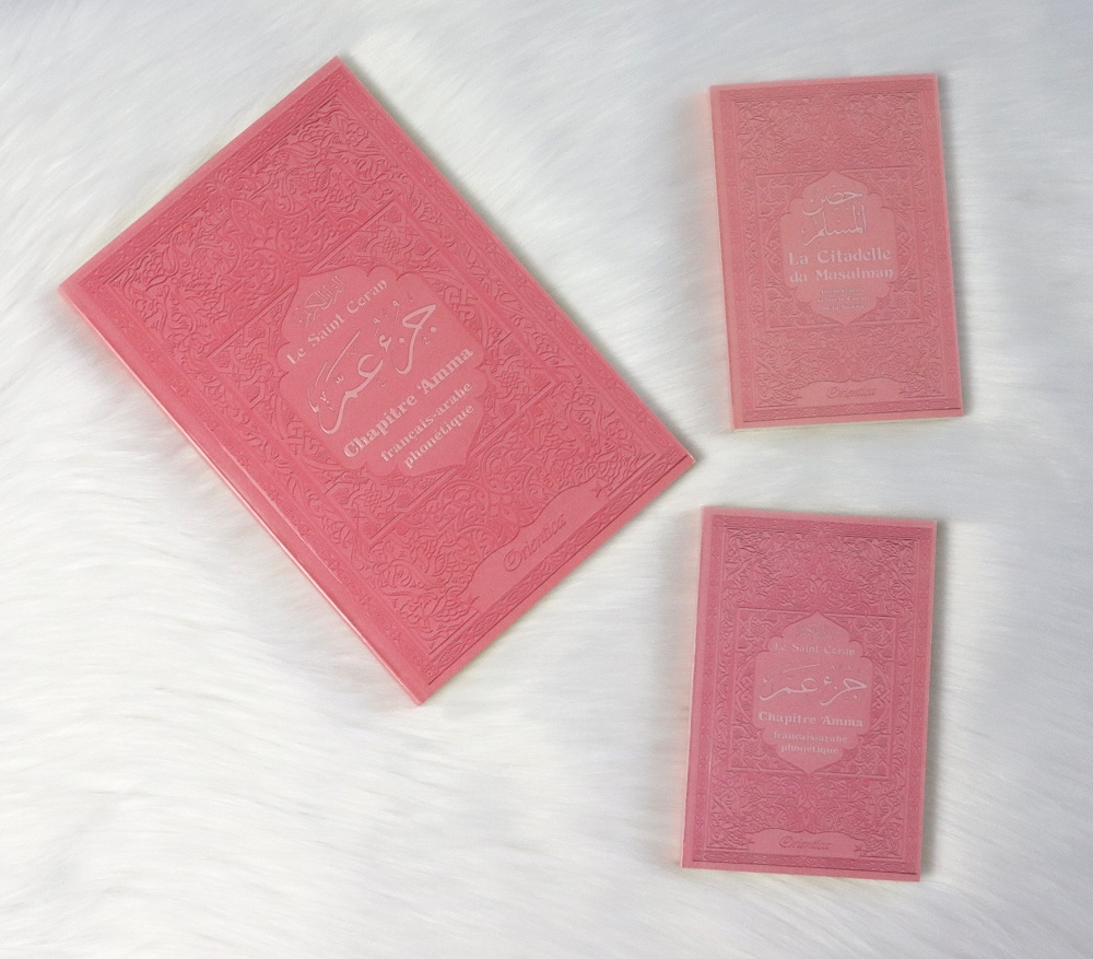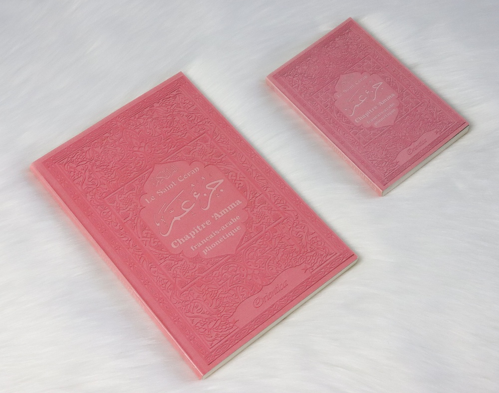 Couverture rose pale. Contient Juz' 'Amâ complet : Hizb 'Amma et Hizb Sabih avec toutes les petites sourates du Coran.