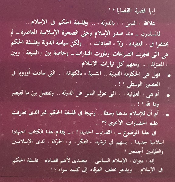 انها قضية القضايا؟ علاقة الدين بالدولة وفلسفة الحكم فى الاسلام، فالمسلمون منذ صدر الاسلام وحتى الصحوة الاسلامية المعاصرة لم يختلفوا فى العقيدة ولا العبادات ولكن سياسة الدولة وفلسفة الحكم هى التى فجرت الصراعات وبلورت التيارات وخاصة بين الشيعة وبين المعتزلة ومعهم كل تيارات الاسلام، فهل هى الحكومة الدينية الشبية بالكهانة، التى سادت اوروبا فى العصور الوسطى ؟ ام هى العلمانية التى تعزل الدين عن الدولة وتفصل بين ما لقيصر وما لله، ام أن للاسلام مذهبا وسطا ومهجا فى فلسفة الحكم غير الذى تعارف عليه الحضارات الاخرى ؟ فى هذا الموضوع القديم الجديد يقدم هذا الكتاب اجتهادا اسلاميا جديدا يسهم فى ترشيد الفكر و الحركة لدى الاسلاميين والعلمانيين اجمعين. انة ديوان الاسلام السياسى يتصدى لاهم قضايا فلسفة الحكم فى الاسلام ويدعو مختلف الفرقاء الى كلمة سواء.