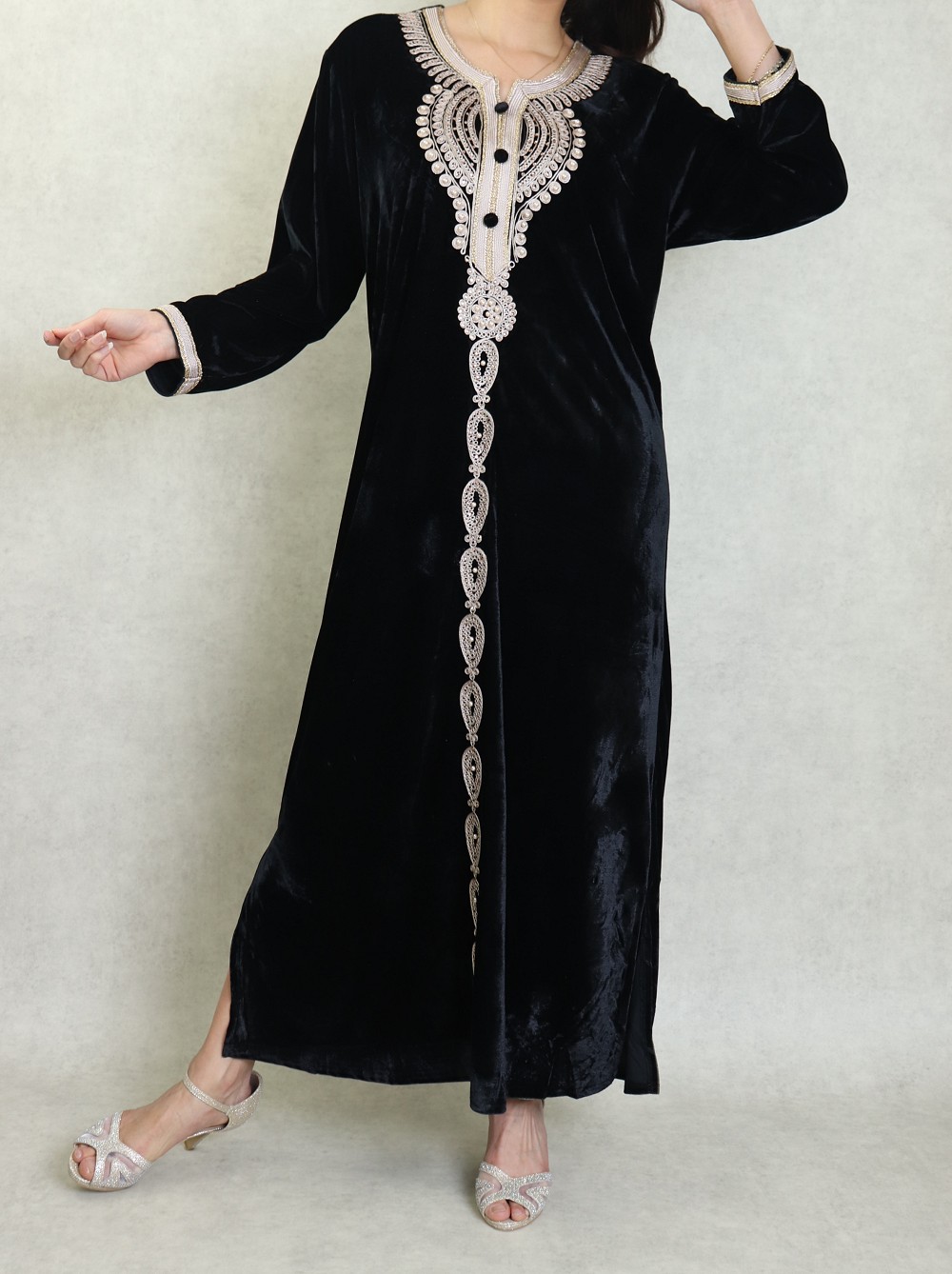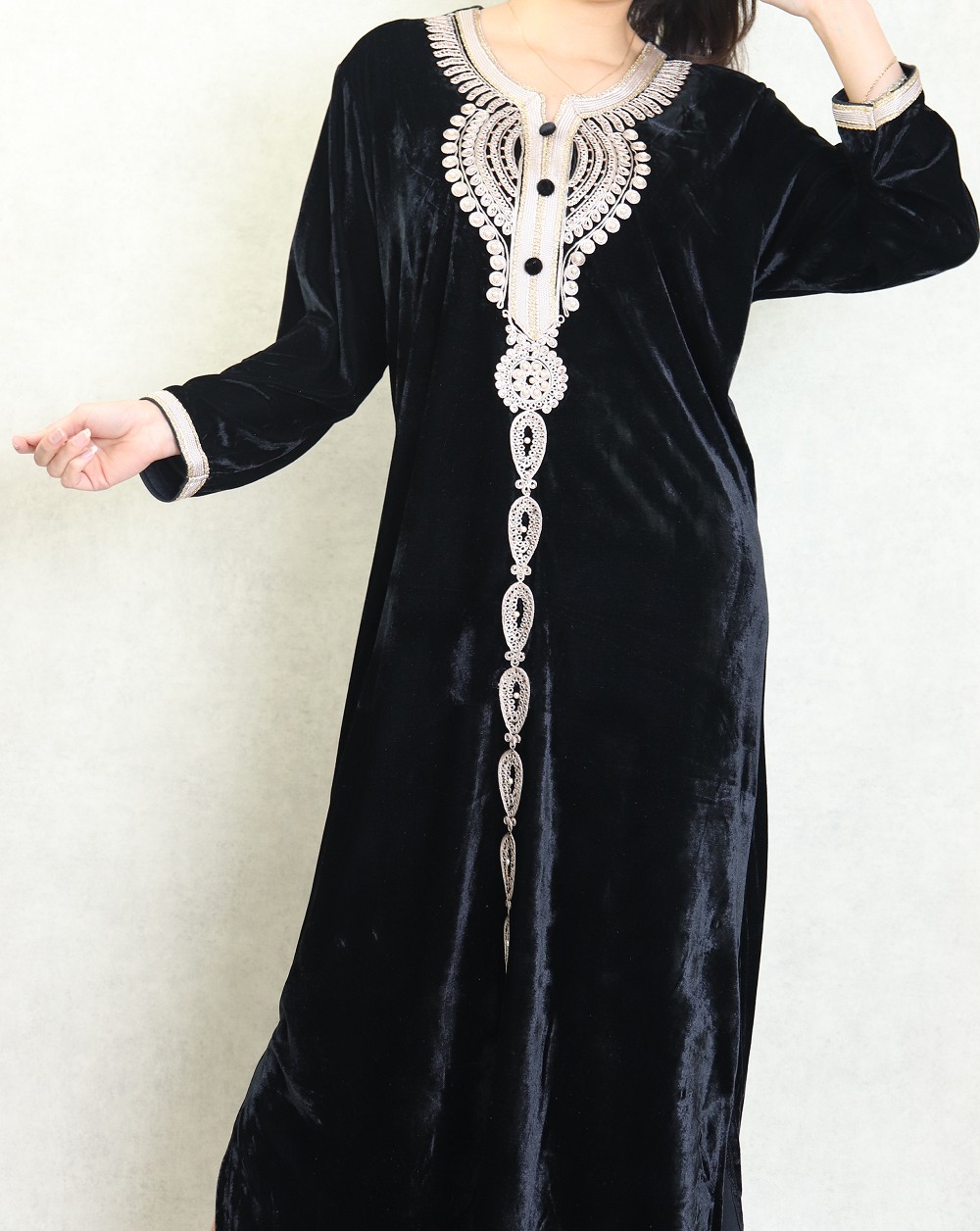 Robe longue en velours avec broderies sur tout le long (Robes Automne-Hiver pour femme) - Couleur Noir Vetement & Accessoire