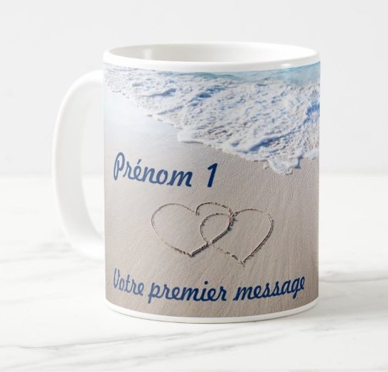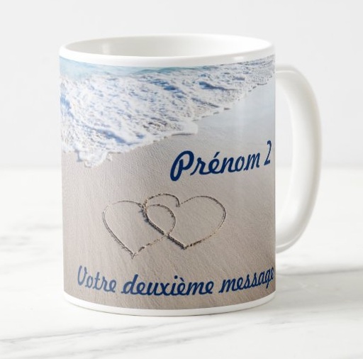 Recevez ce mug original et unique avec deux cœurs dessinés sur le sable de la plage, magnifique photo du sable aplati par la mer et caressé par son écume...