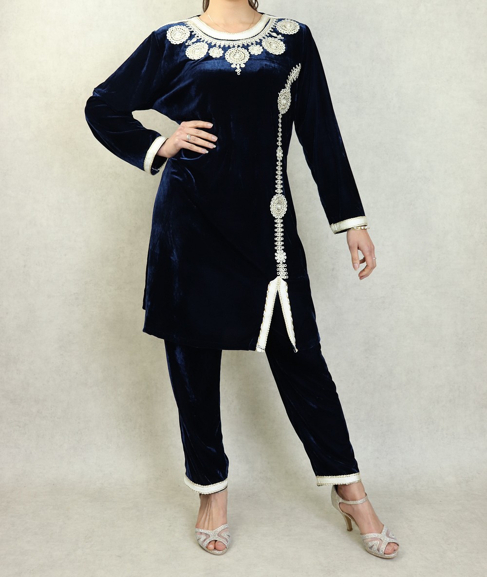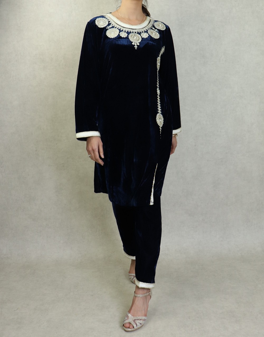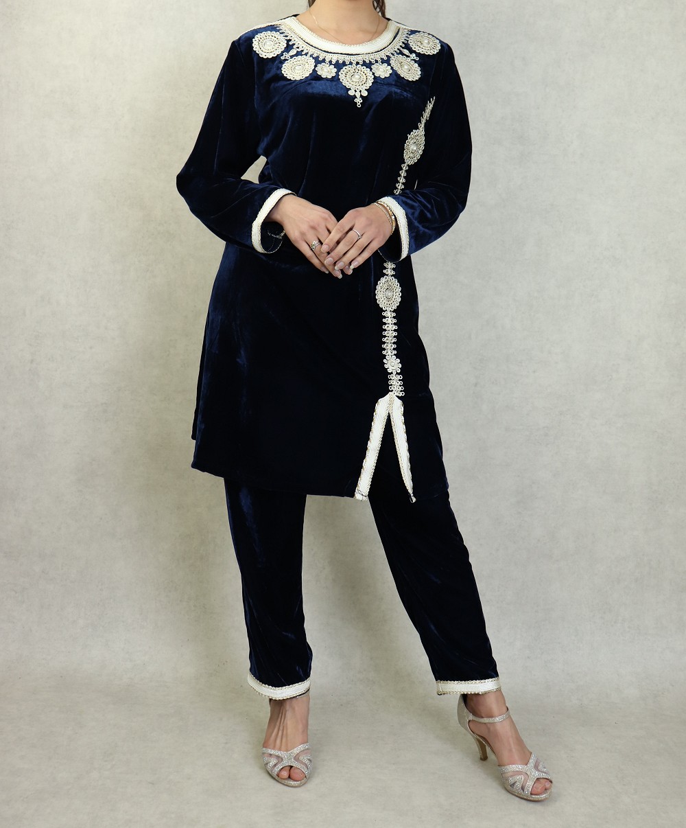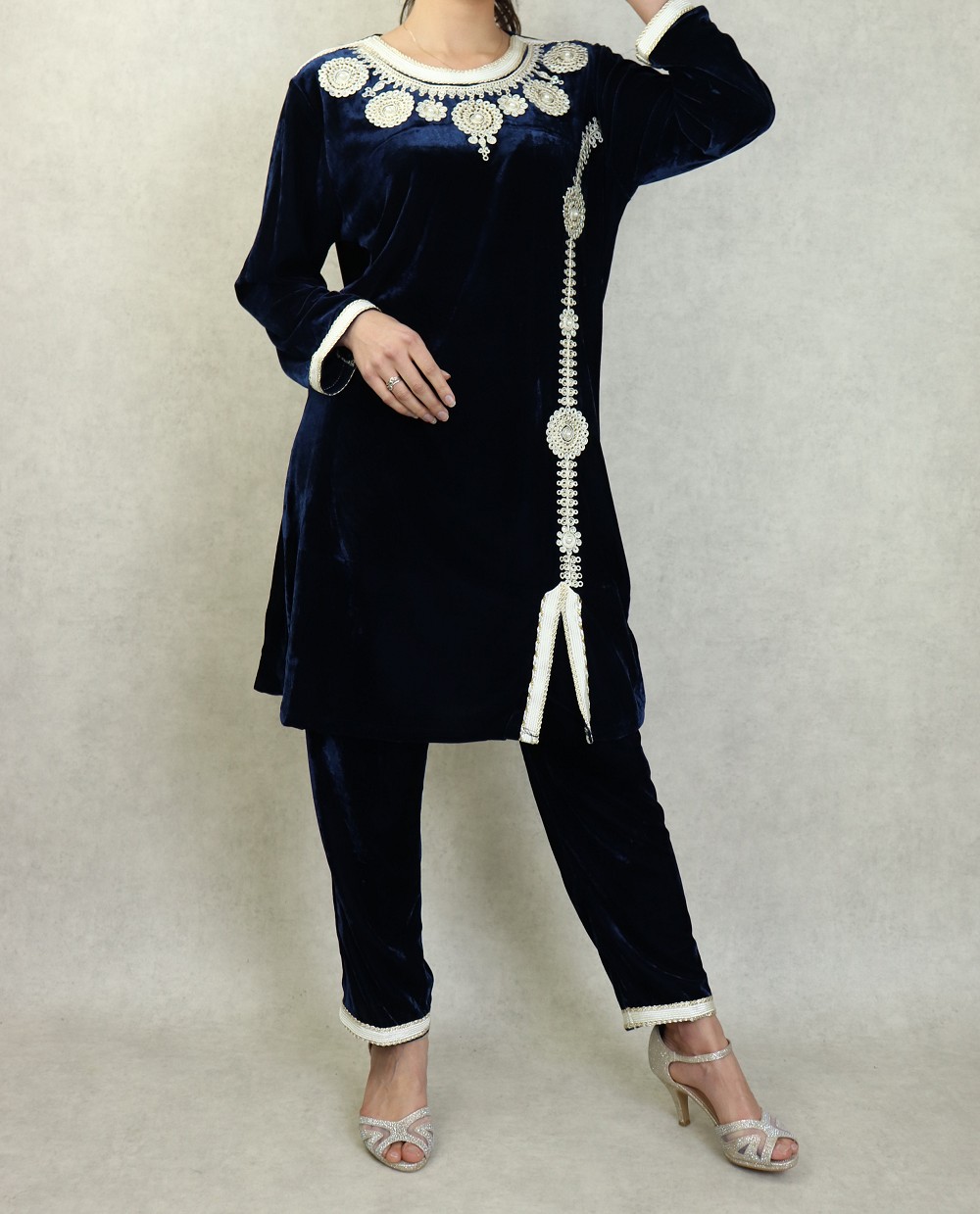 Ensemble style Jabador velours avec broderies pour femme - Deux pieces tunique pantalon - Couleur Bleu marine