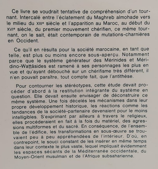 Ce livre se voudrait tentative de compréhension d'un tournant. Intercalé entre l'éclatement du Maghreb almohade vers le milieu du XIIIe siècle et l'apparition au Maroc, au début du XVIe siècle, du premier mouvement chérifien, ce même tournant, on le sait, était contemporain de mutations-charnières en Occident.