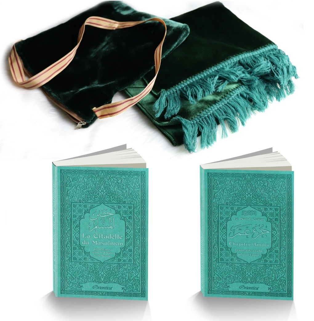 Recevez ce sac de voyage original avec fonction coussin (oreiller) de couleur vert assortis. Cette sacoche avec fermeture zip contient un tapis de prière adulte, un Coran Jouz' 'Ammâ, une citadelle du musulman, et un parfum musc sans alcool "Al-Baraka" de la marque "Musc d'Or" (mixte).