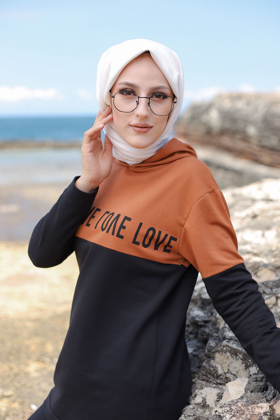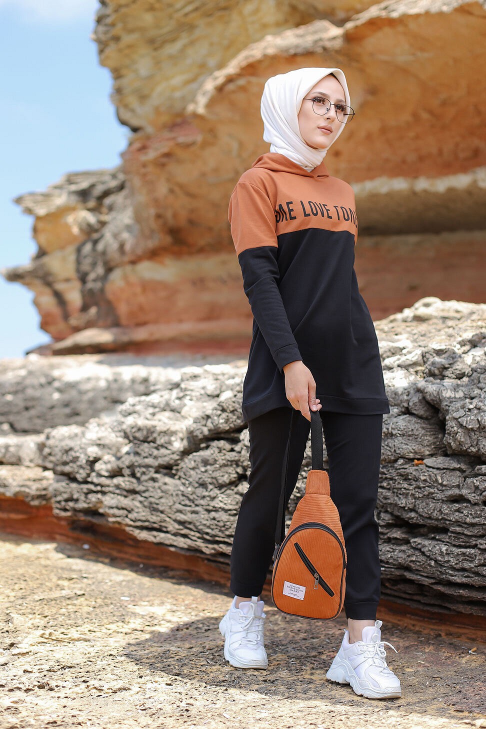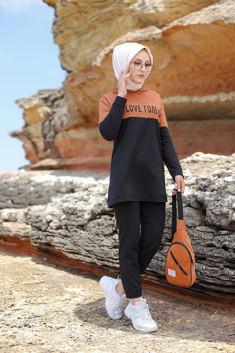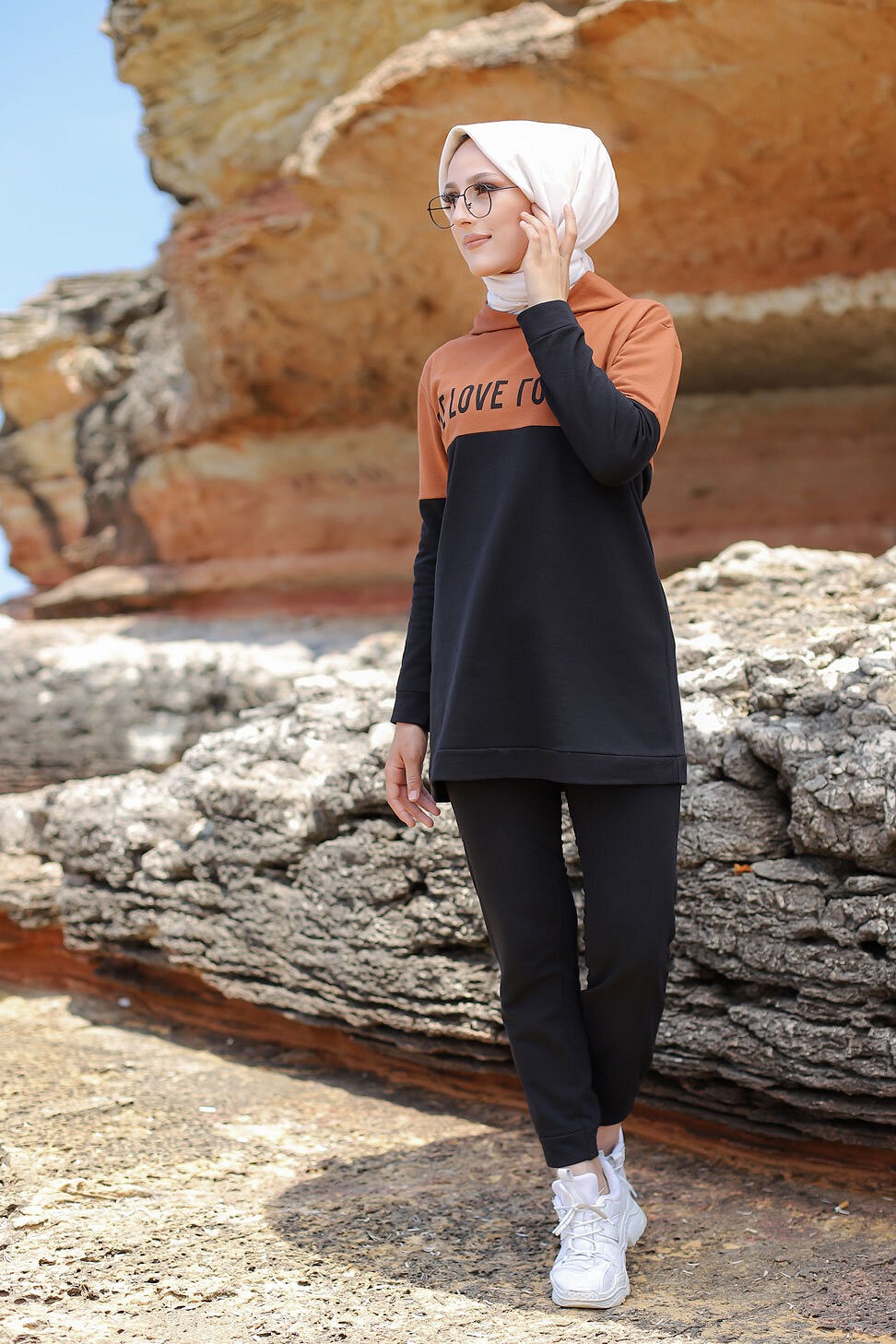 Survêtement hijab sport chic à capuche pour femme musulmane (deux pièces haut et bas) - Couleur noir et rouille Vetement & Accessoire