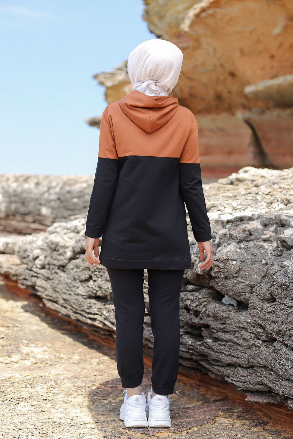 Survetement hijab sport chic a capuche pour femme musulmane (deux pieces haut et bas) - Couleur noir et rouille