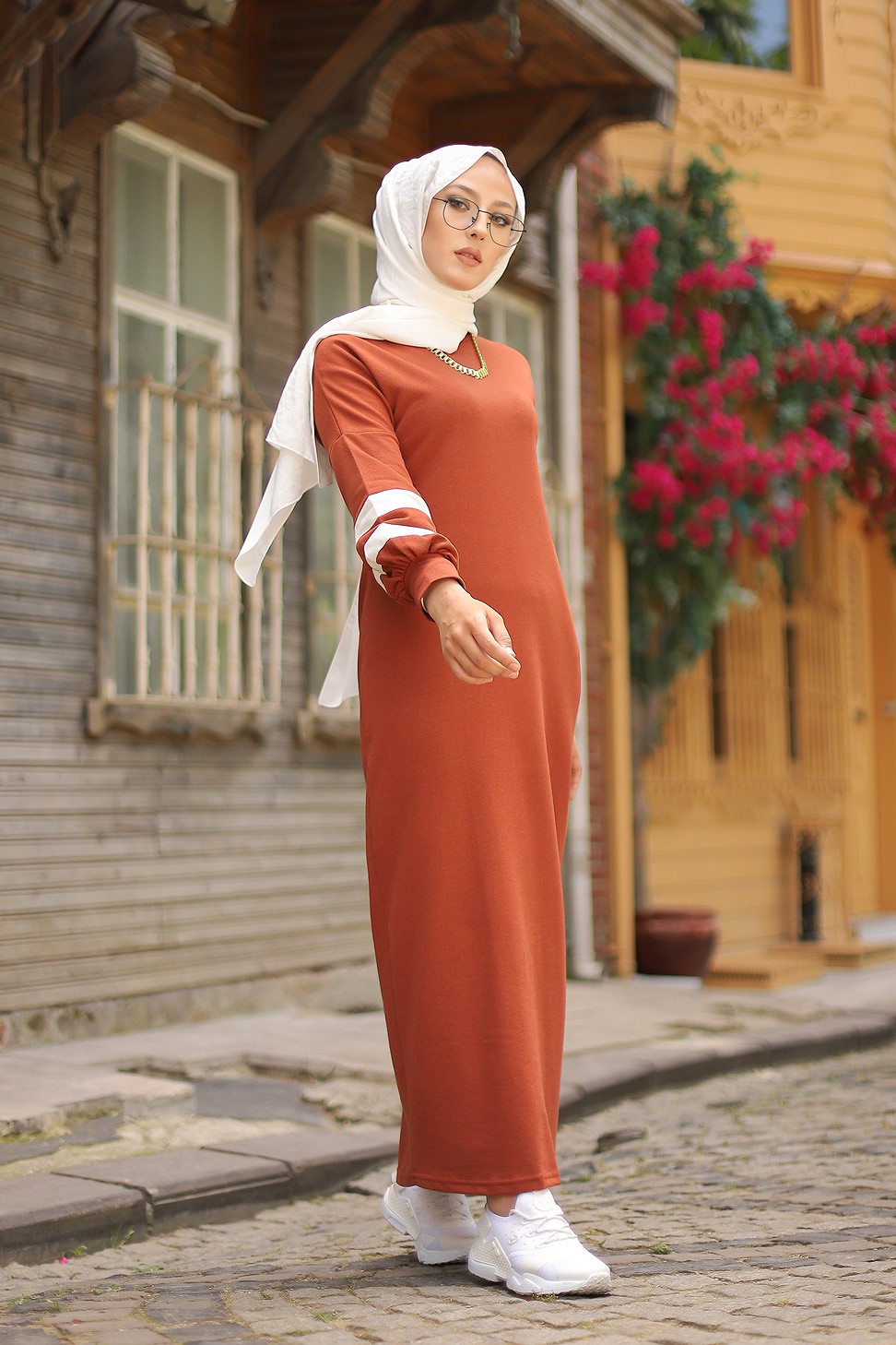 Robe longue, col rond, manches longues légèrement bouffantes, coupe droite.