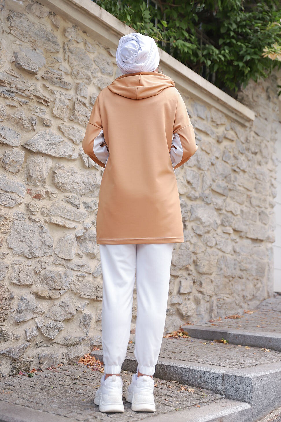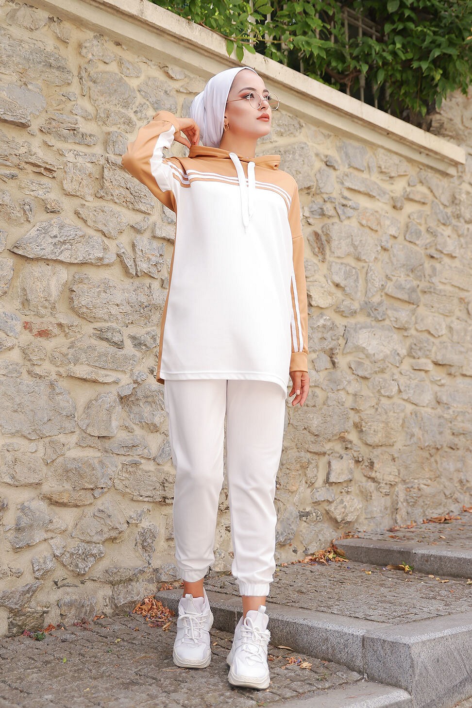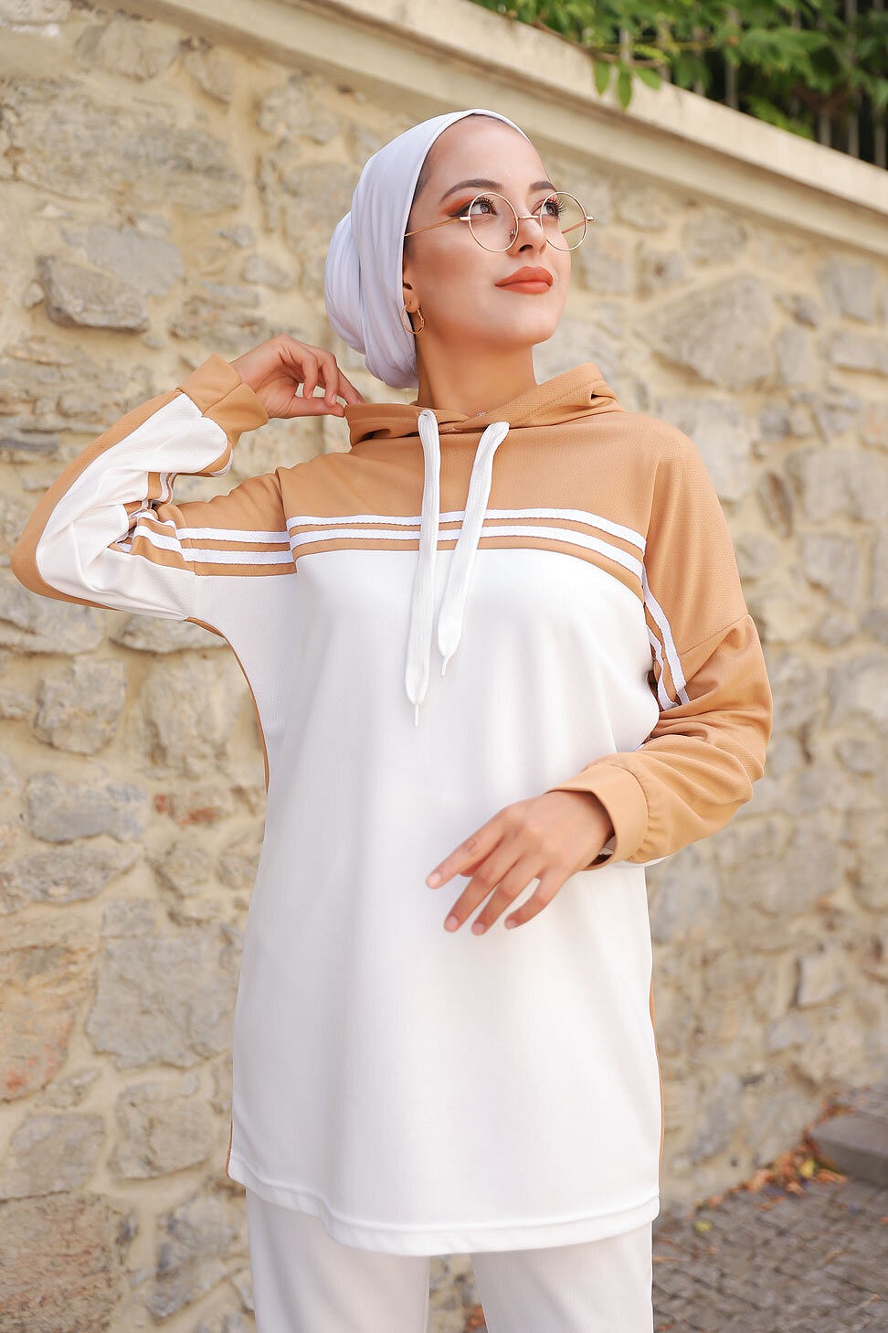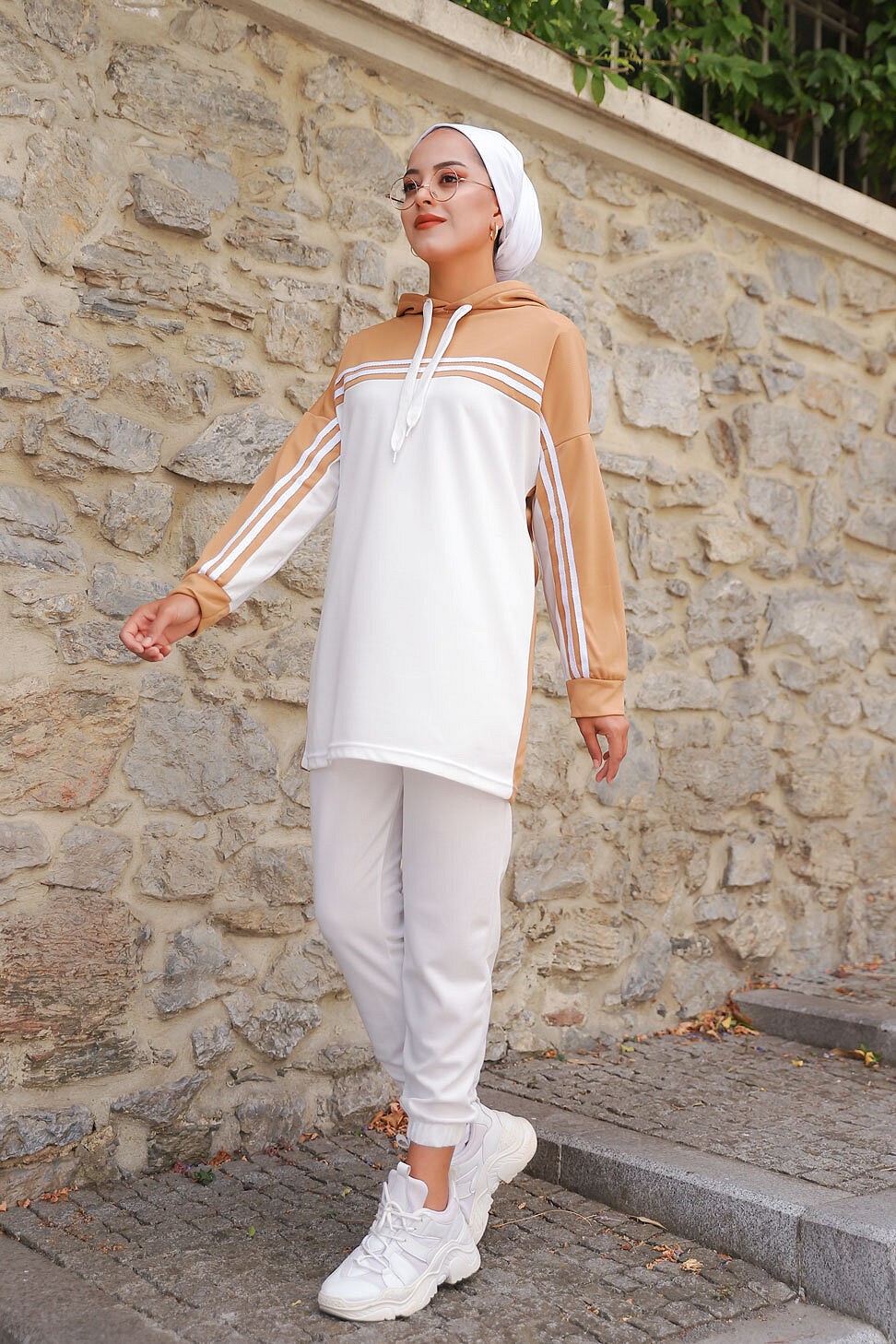 Survêtement femme à capuche bicolore (Ensemble sport pas cher pour moutahajiba) - Couleur beige avec bandes blanches - REF. 35546 (19.90 €)