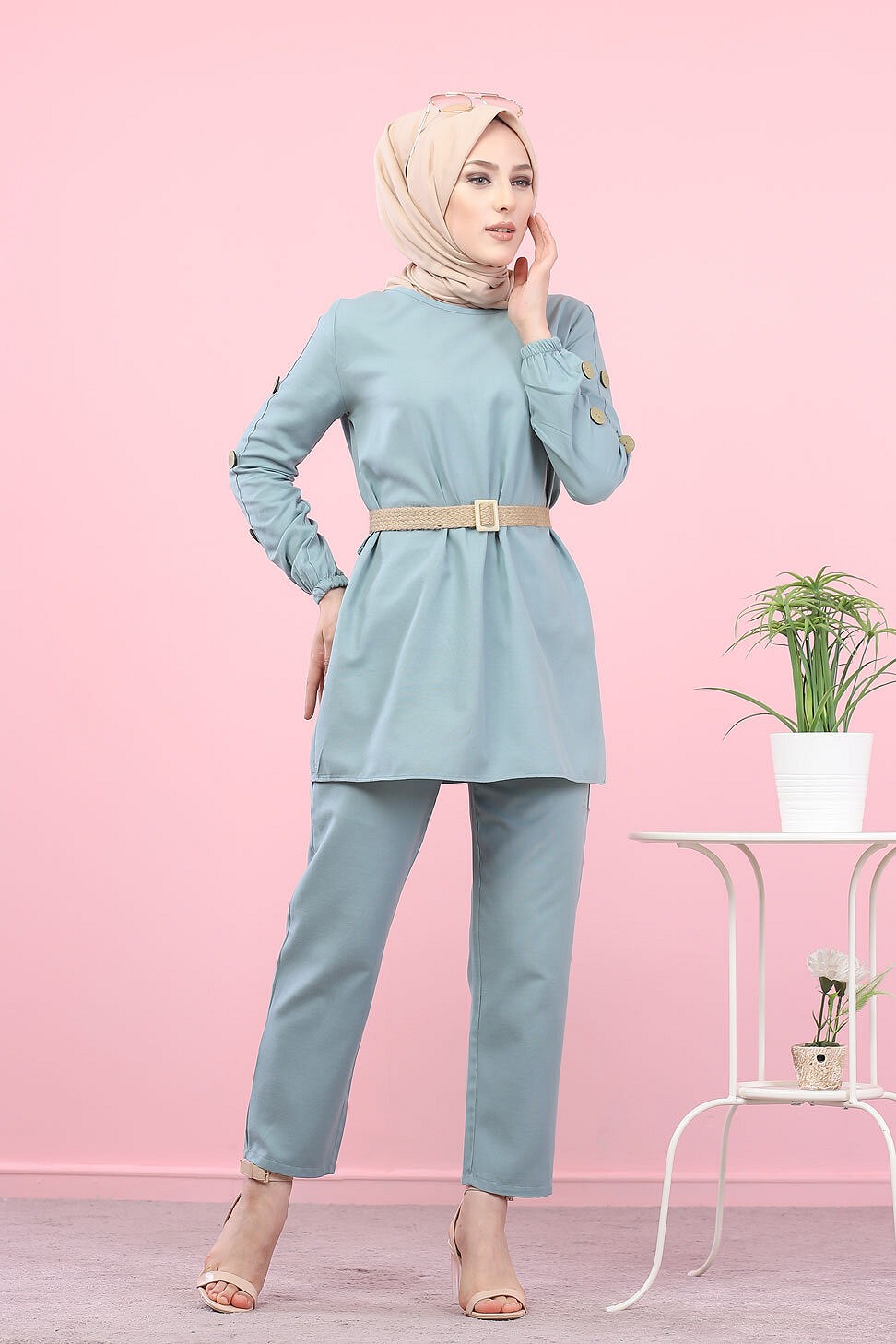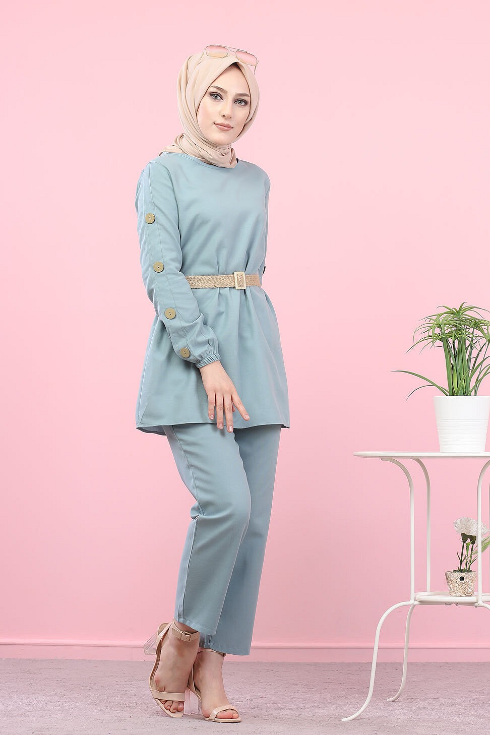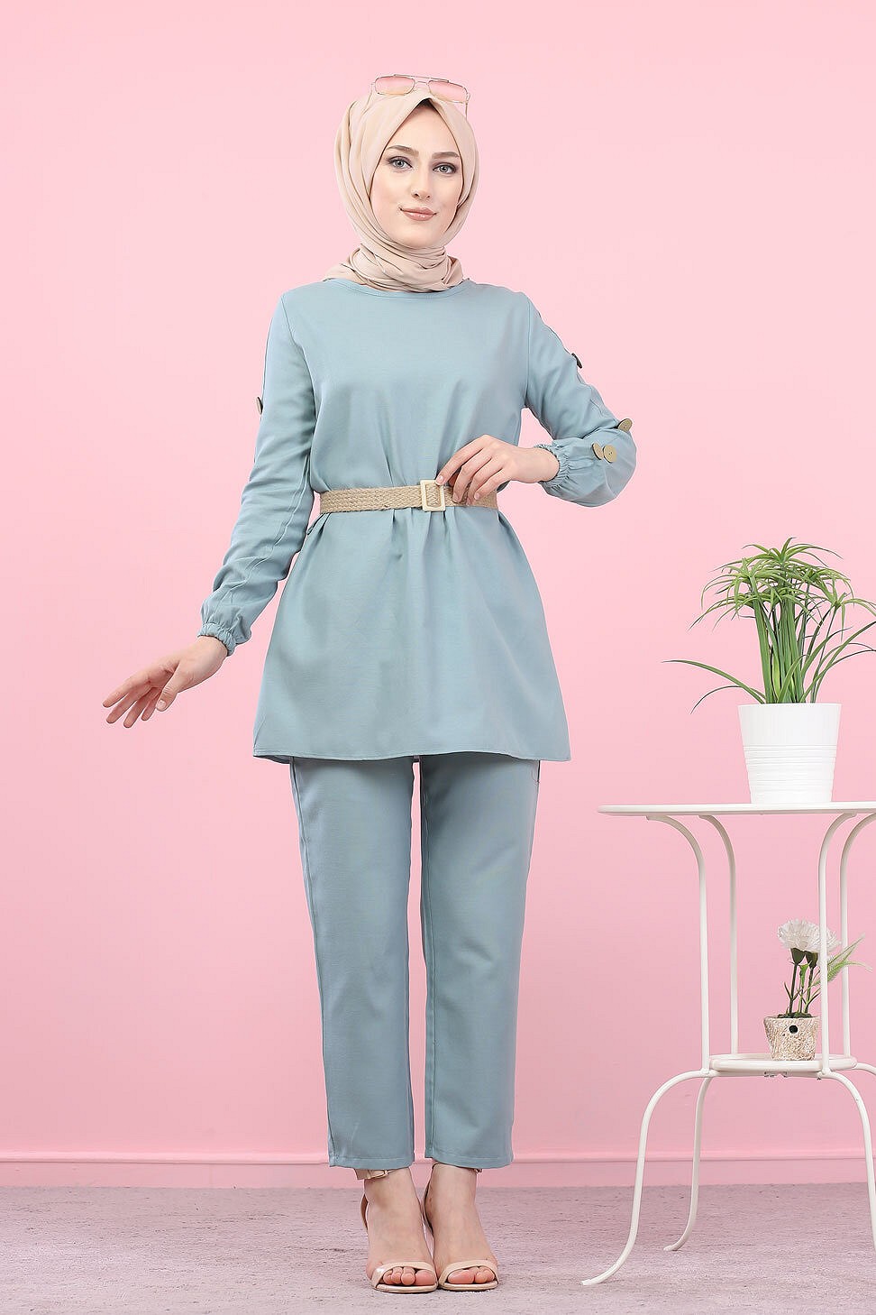 Ensemble tunique et pantalon assorti avec ceinture (Vetement pour femme voilée) - Couleur bleu chiné Vetement & Accessoire