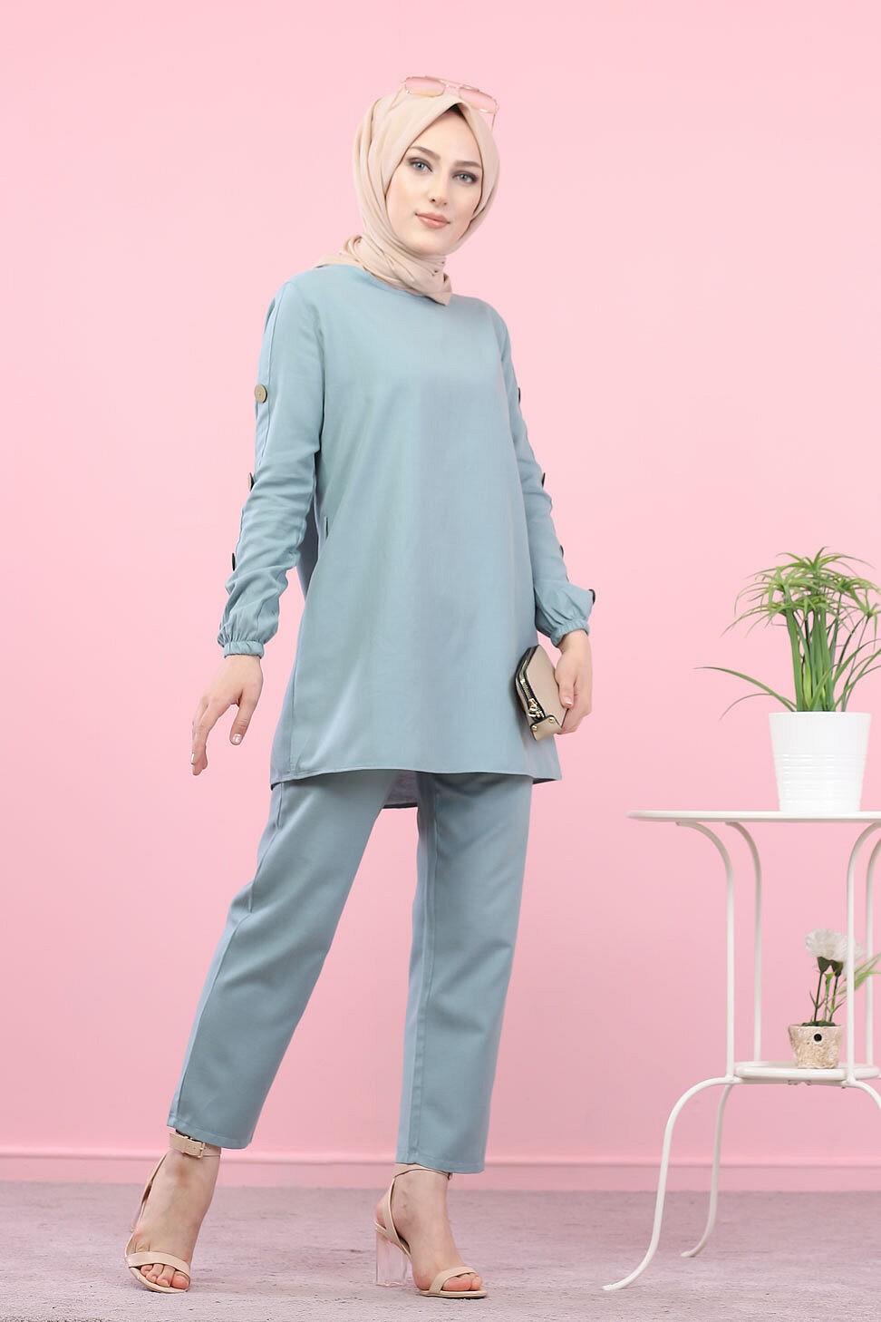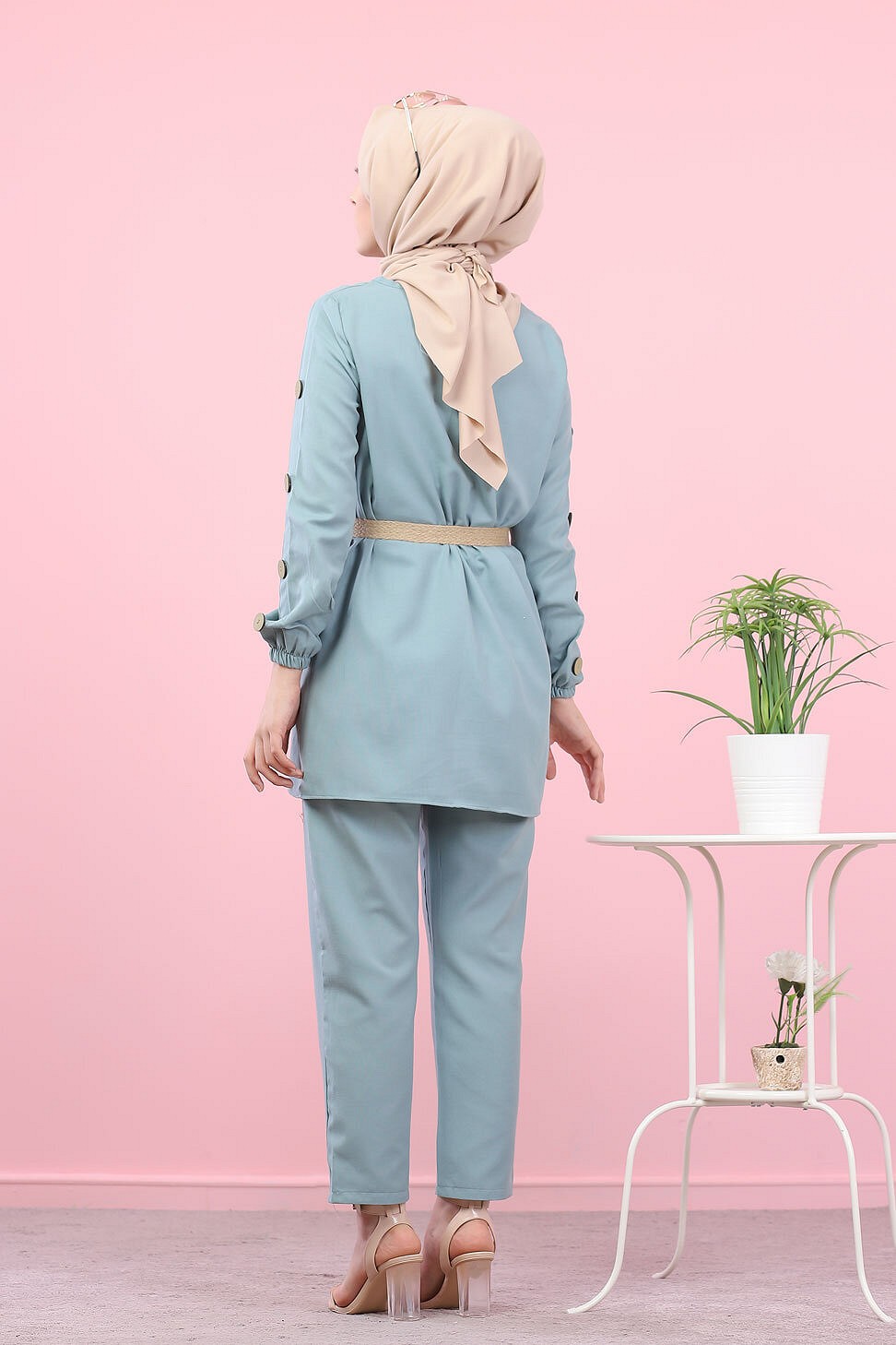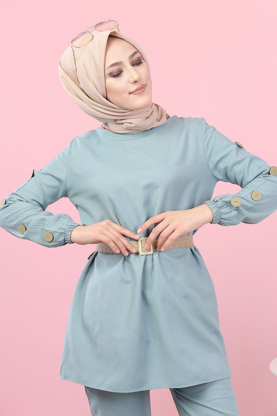 Ensemble tunique et pantalon assorti avec ceinture (Vetement pour femme voilée) - Couleur bleu chiné Vetement & Accessoire