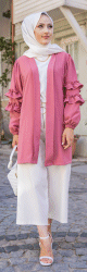 Gilet Veste long col châle manches à froufrou (Look tendance et style Hijabista) - Couleur Rose - REF. 33937 (25.00 €)