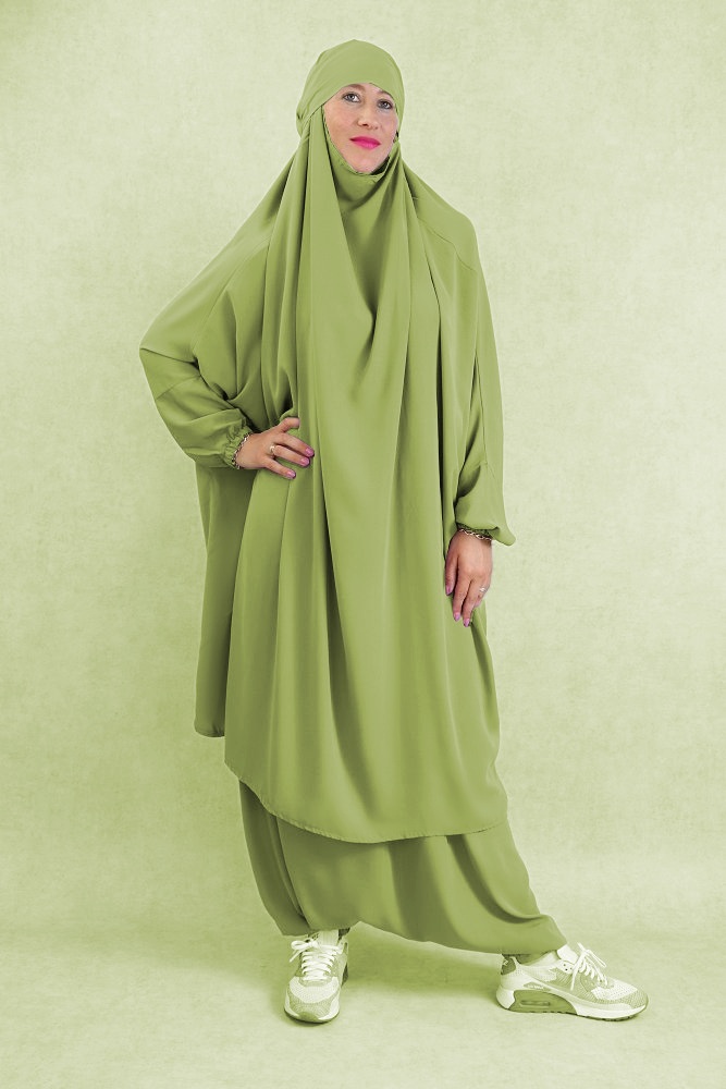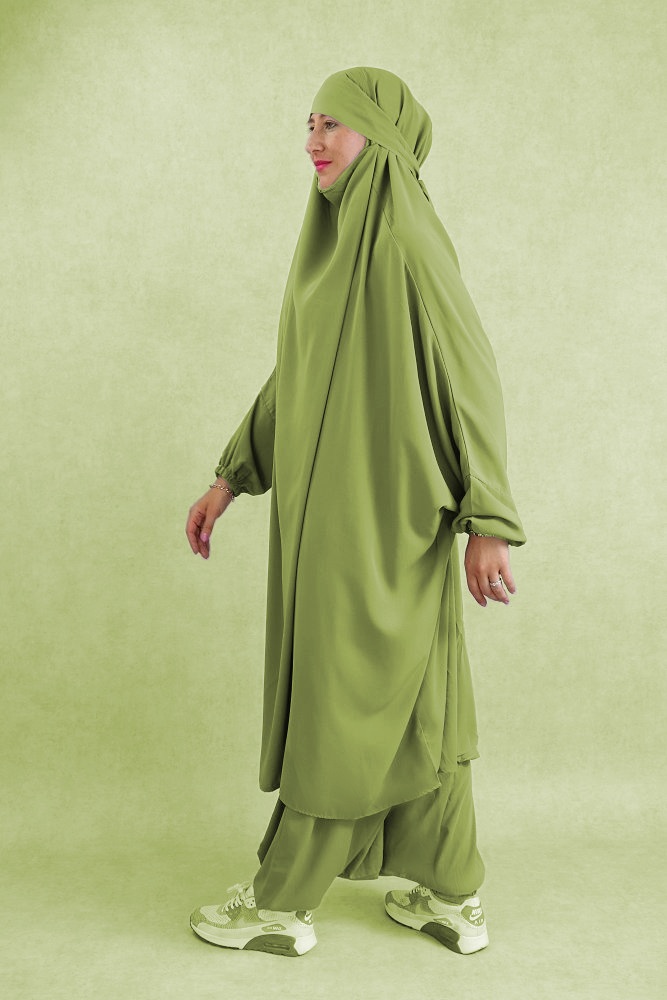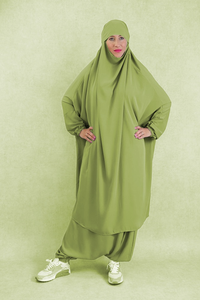 Ce Jilbab deux pièces est composé d’un demi-jilbab cache menton avec bandeau intégré et d’un sarouel (pantalon).