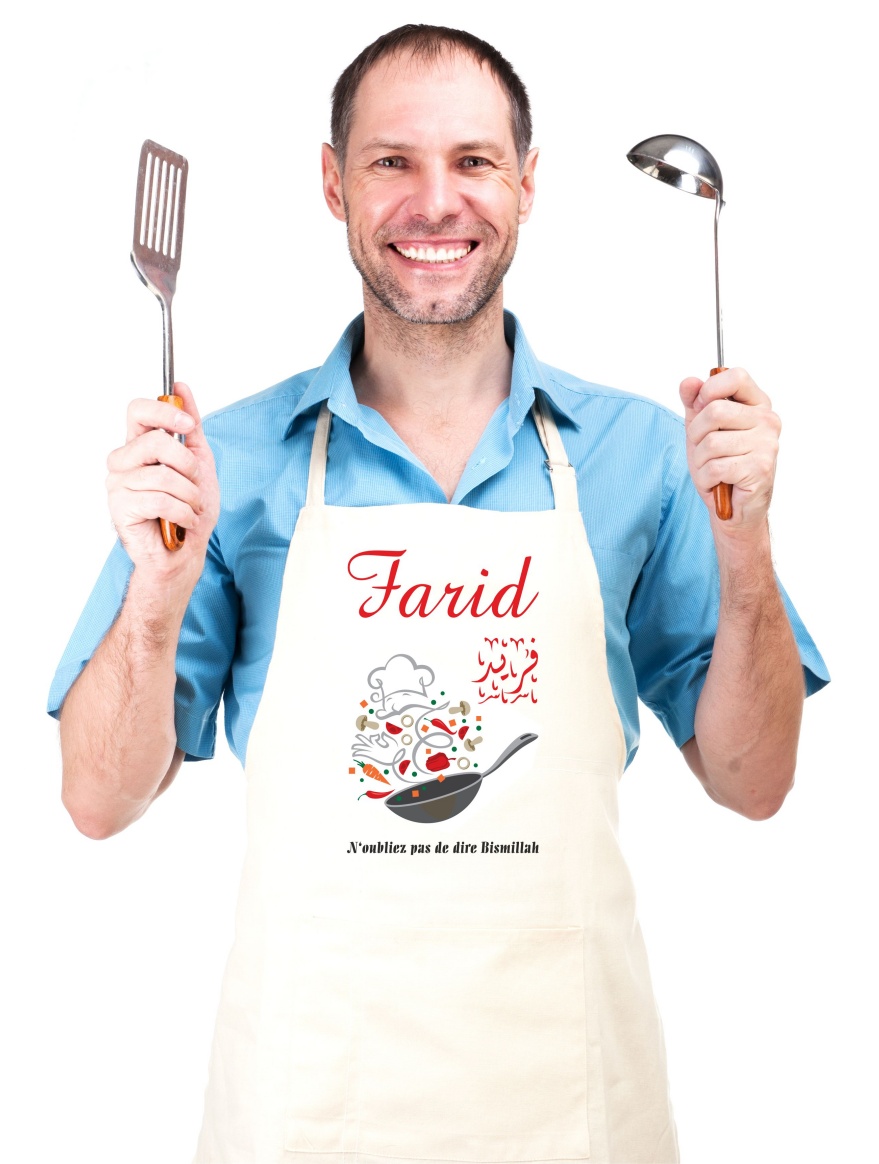 Recevez ce joli tablier de cuisine (mixte) avec inscription de votre choix (prénom, message, etc.) en français et/ou en arabe et une jolie illustration.