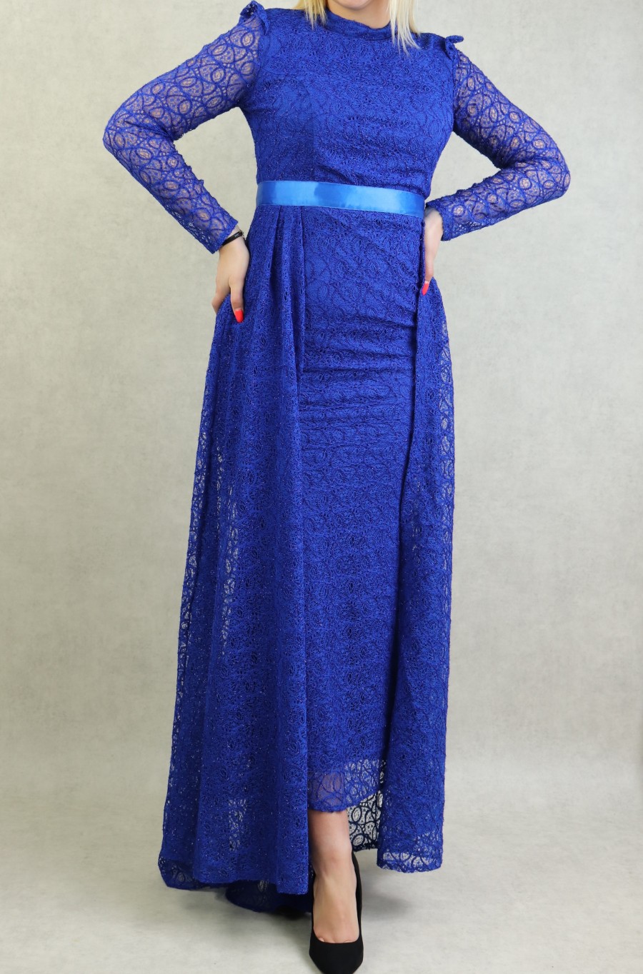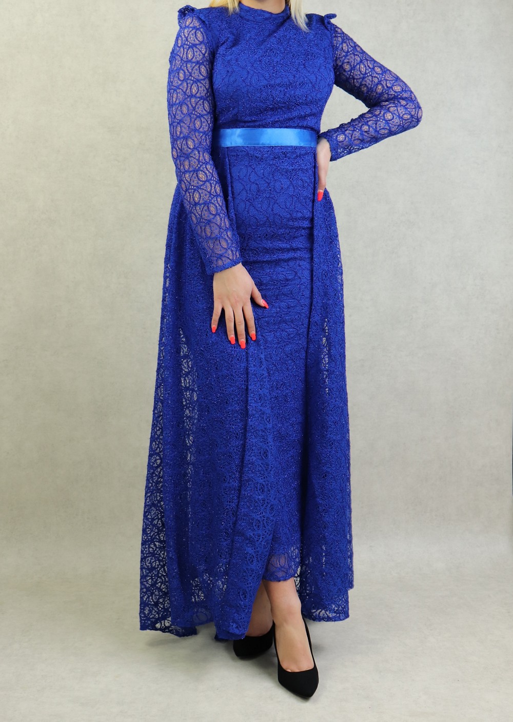 Robe de soiree maxi-longue avec traine en dentelle et collier assorti - Couleur Bleu Roi Marque Amelis Paris