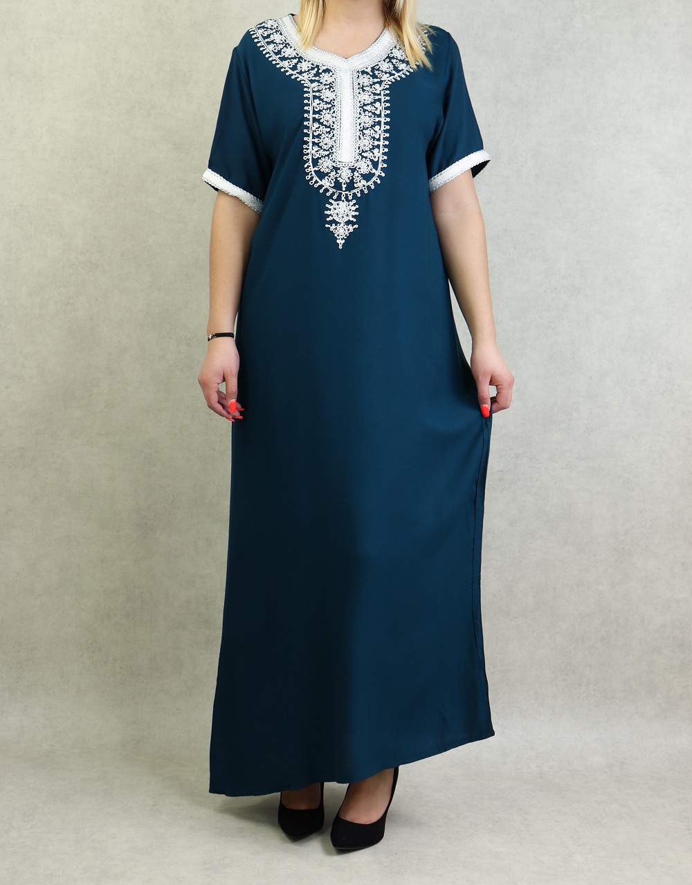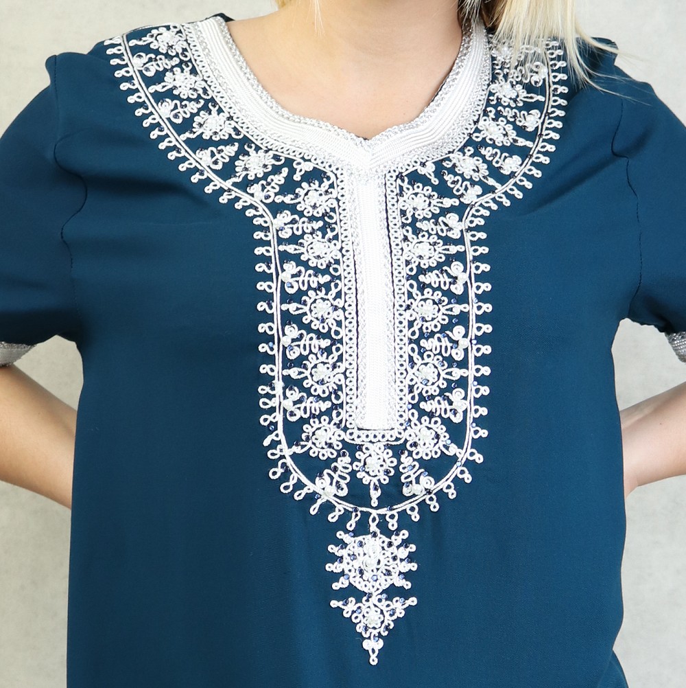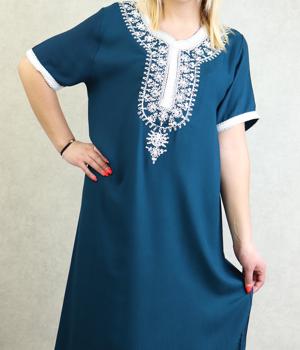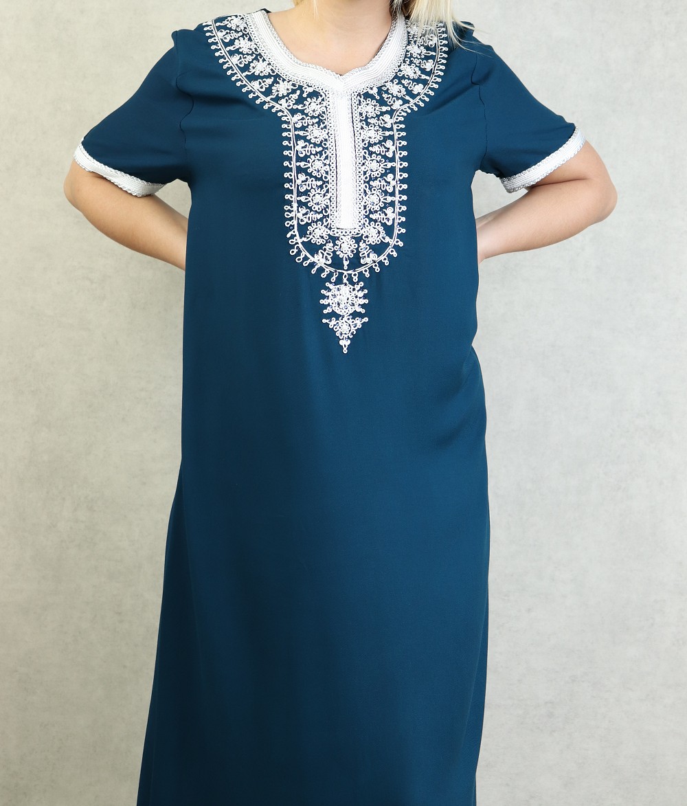 Cette robe orientale à manches courtes, encolure en cœur, tissu doux type coton et léger vous donnera une allure incroyable.