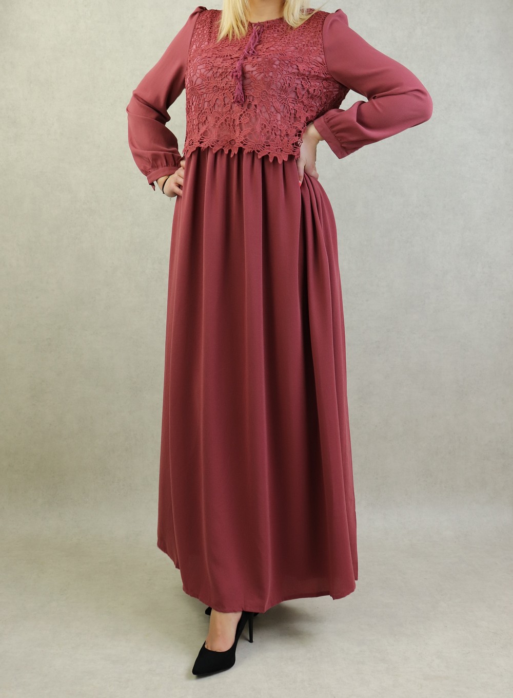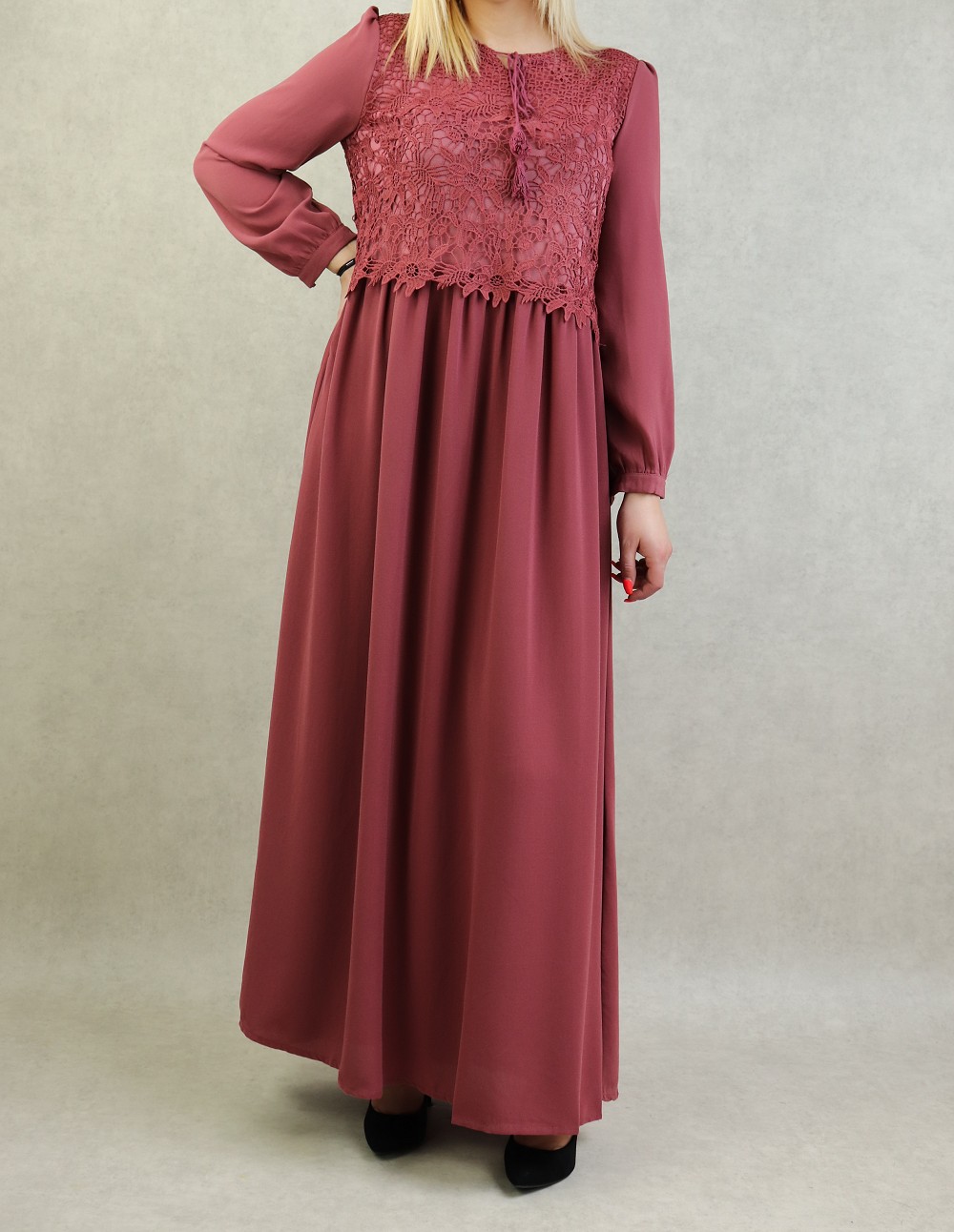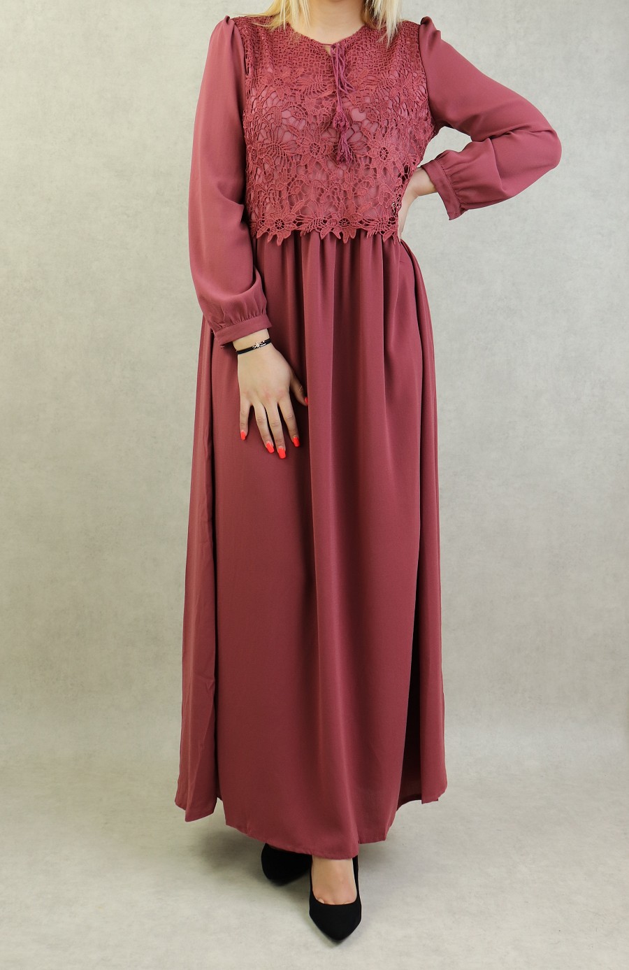 Très belle robe longue taille cintrée. Broderies sur le buste. Coupe évasée vers le bas, entièrement doublée. manches longues finition boutonnée.