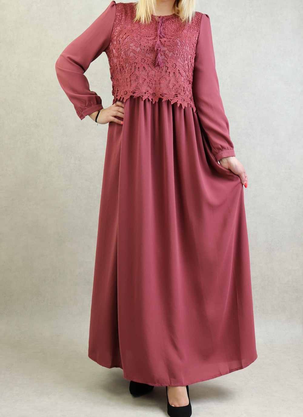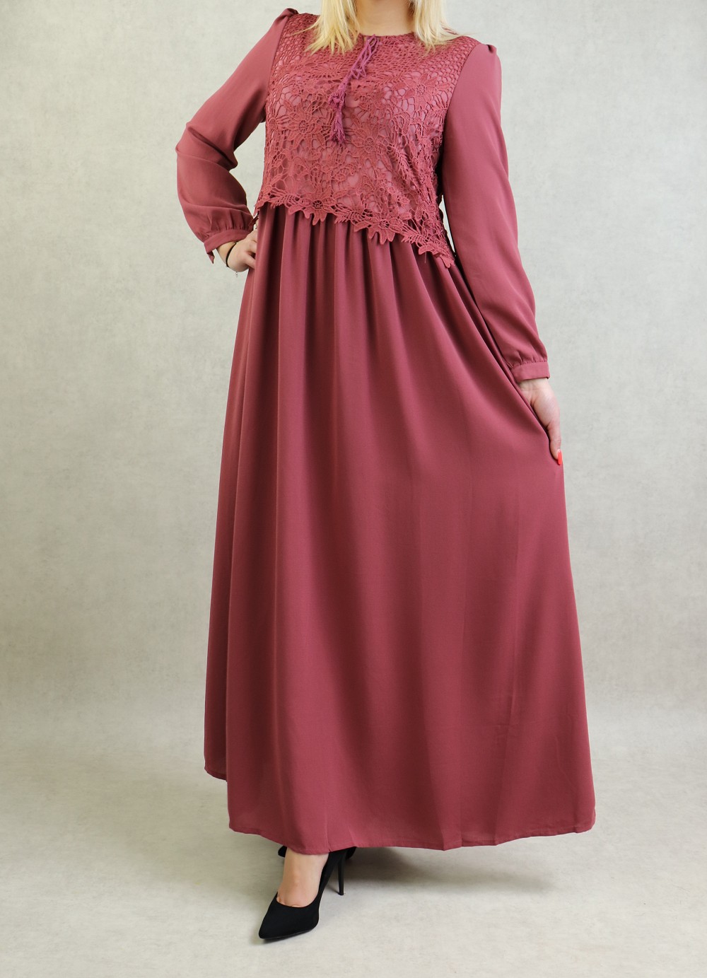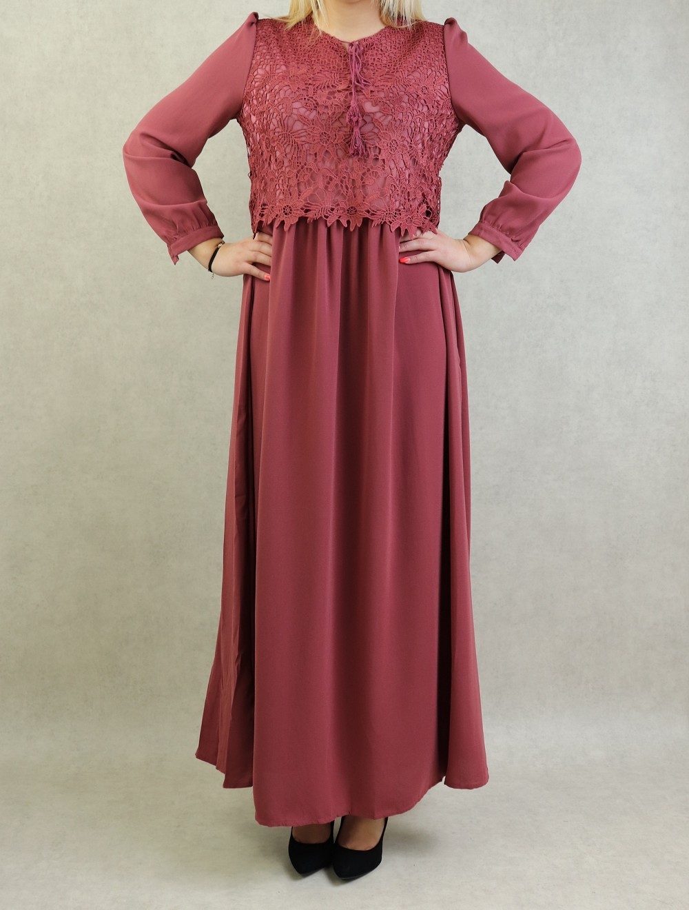 Très belle robe longue taille cintrée. Broderies sur le buste. Coupe évasée vers le bas, entièrement doublée. manches longues finition boutonnée.