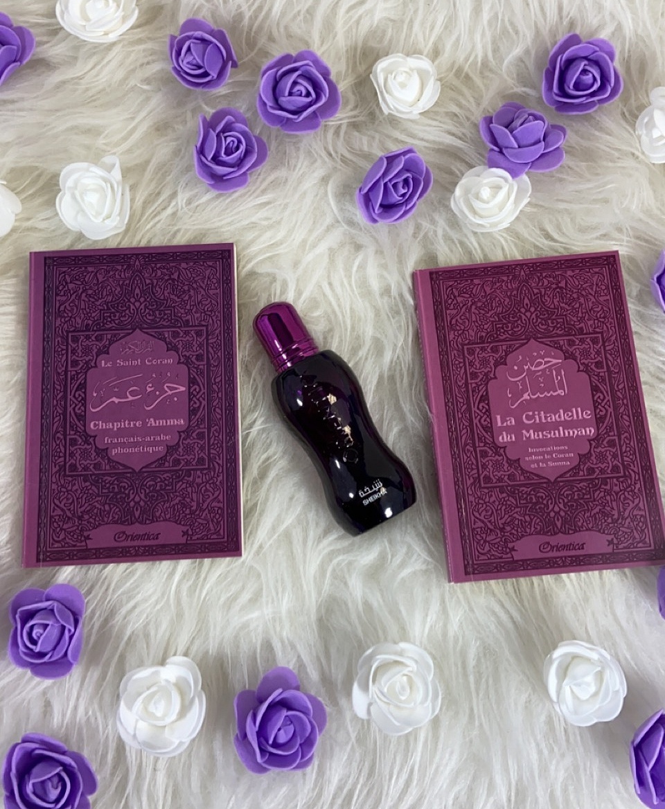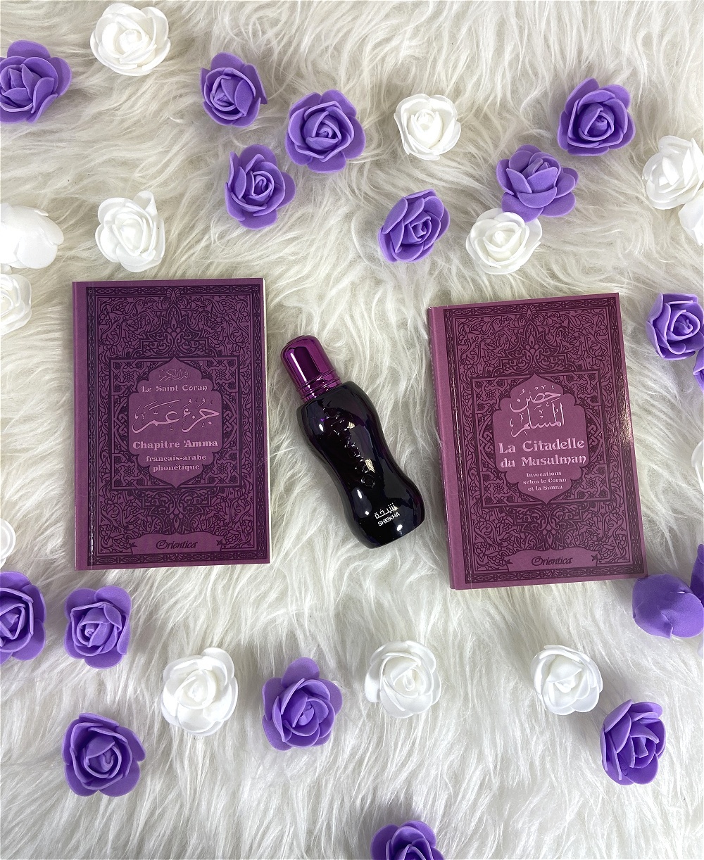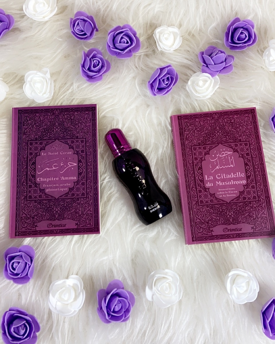 Joli pack cadeau mauve pour femme musulmane, constitué de trois produits assortis (livres en français/arabe/phonétique) :