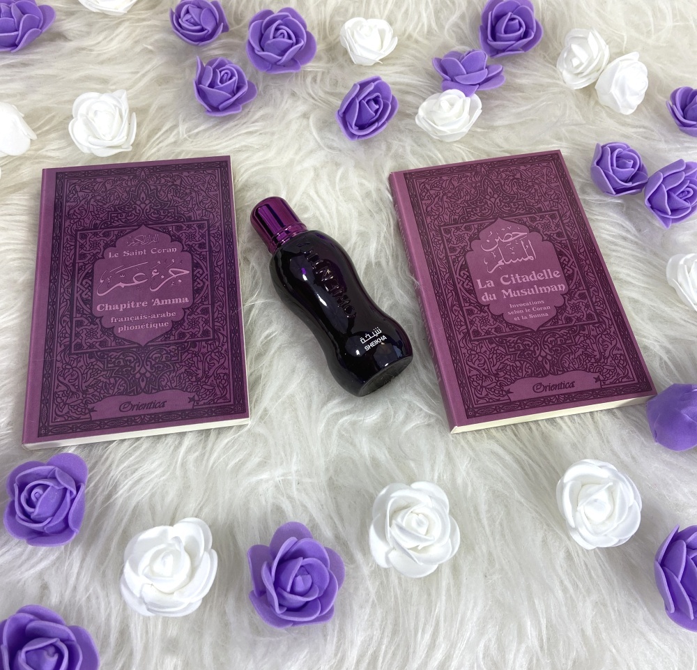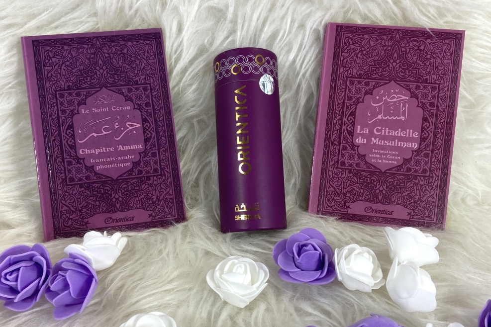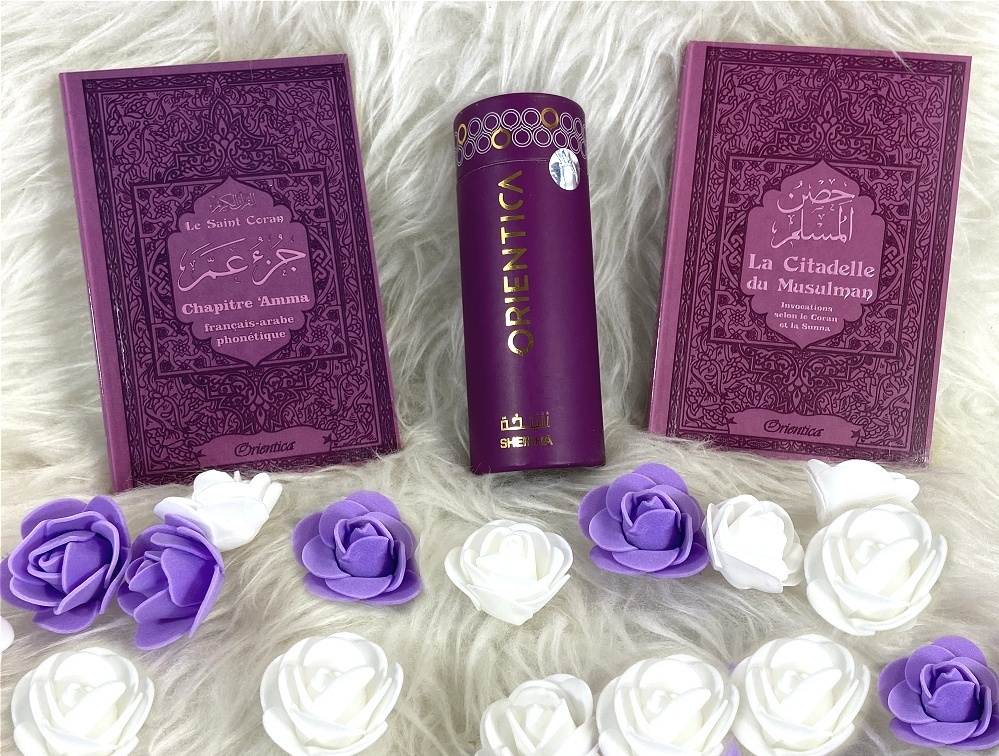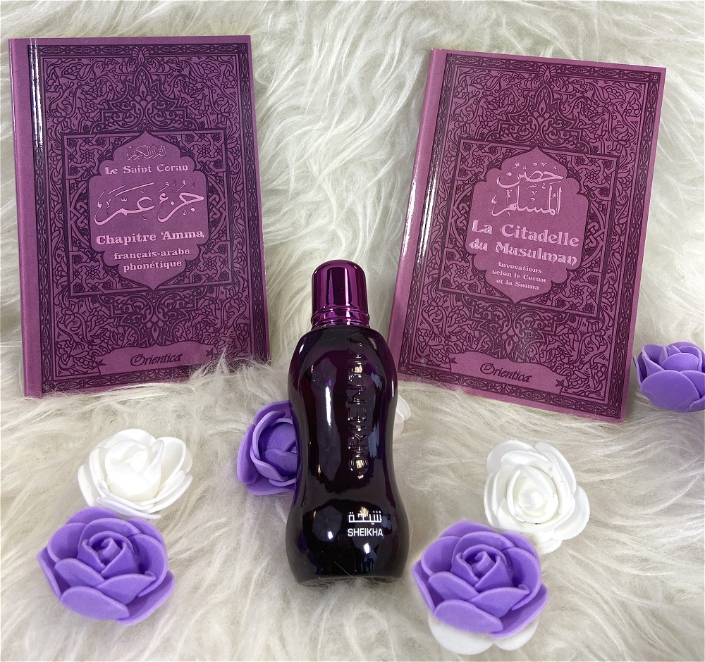 Joli pack cadeau mauve pour femme musulmane, constitué de trois produits assortis (livres en français/arabe/phonétique) :