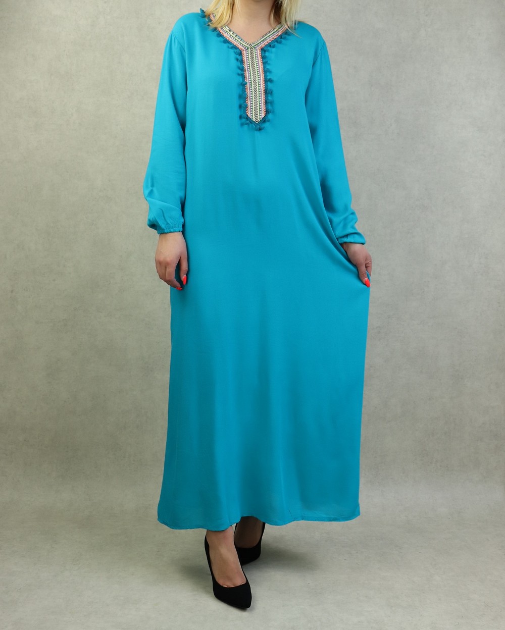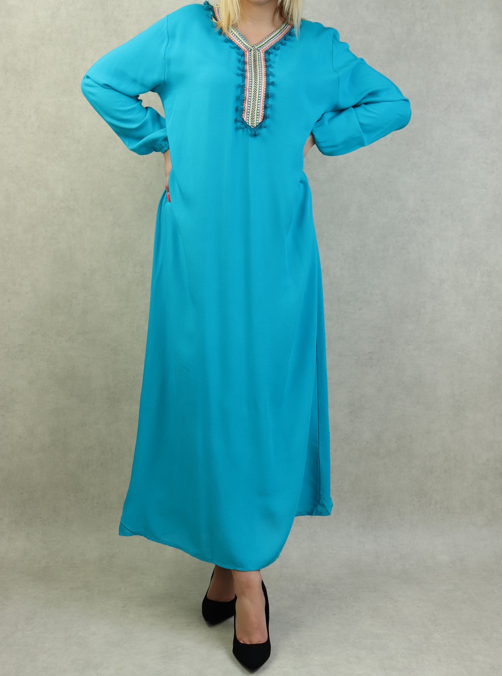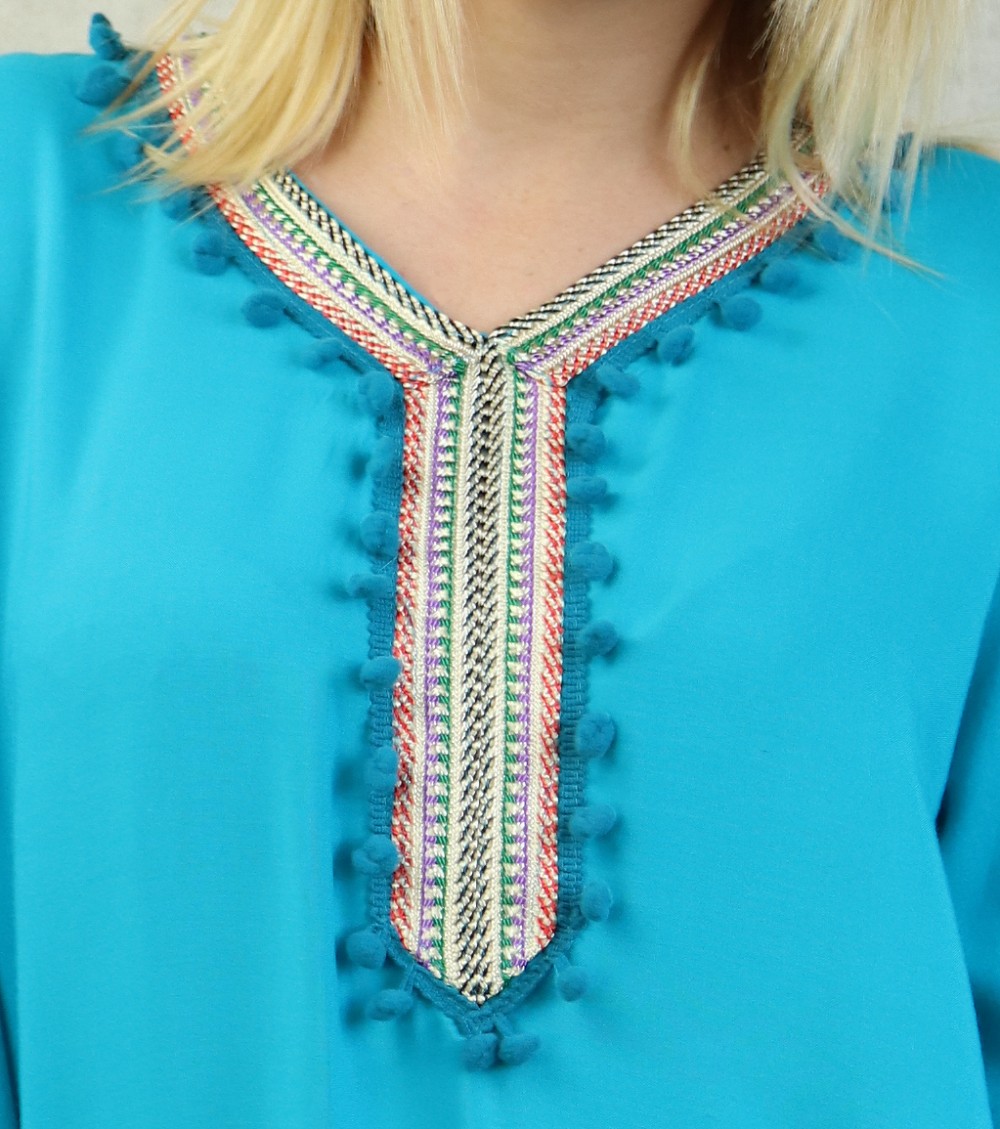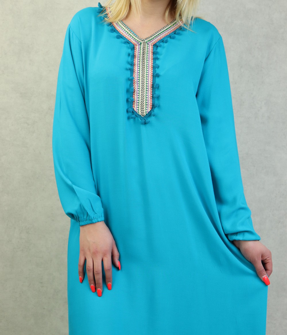 Robe d’été fluide et légère de couleur unie. Manches longues finition élastiques aux poignets. broderie multi couleur au niveau de col en V et le buste. Petits pompons sur le devant.