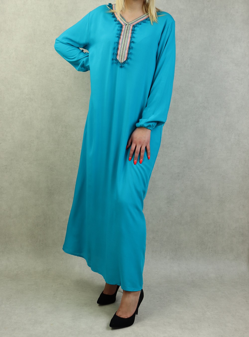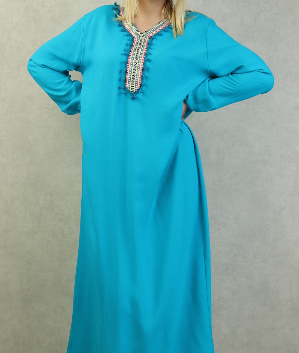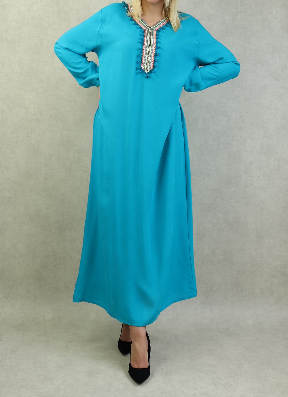 Robe d’été fluide et légère de couleur unie. Manches longues finition élastiques aux poignets. broderie multi couleur au niveau de col en V et le buste. Petits pompons sur le devant.