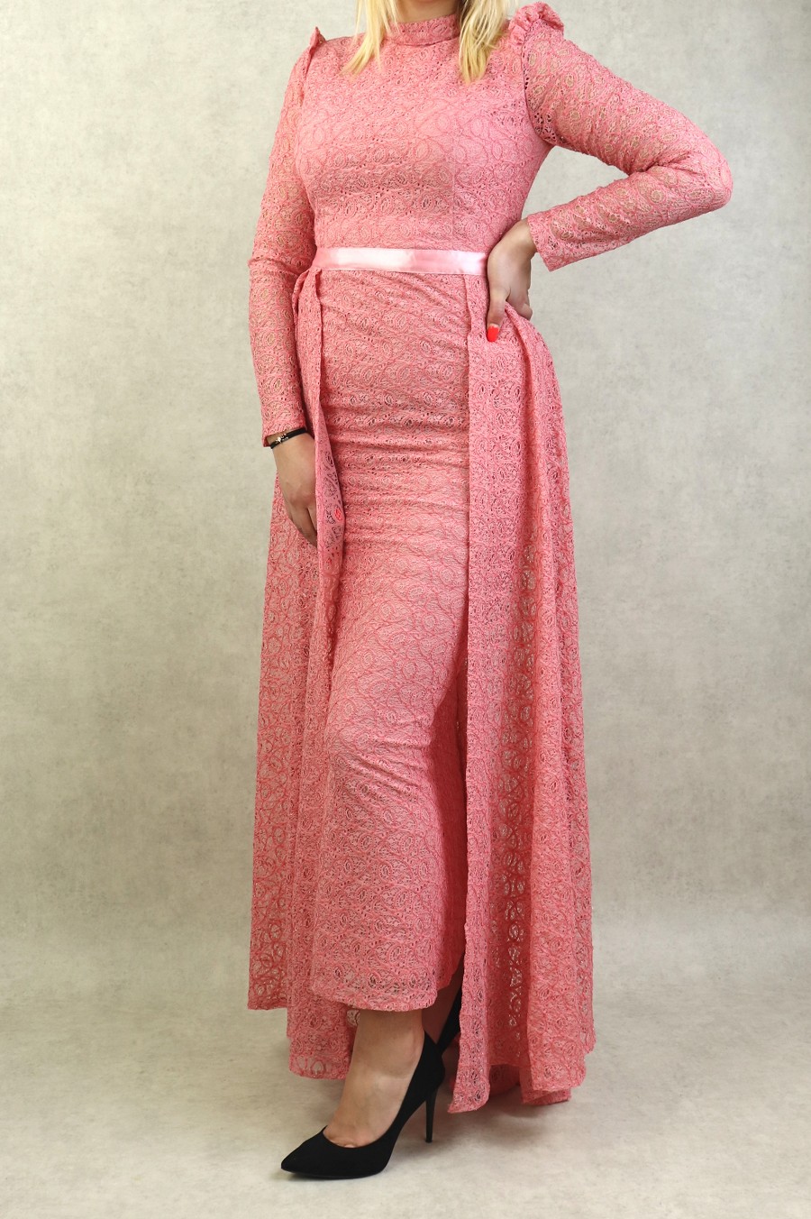 Robe de soirée maxi-longue avec traîne en dentelle et collier assorti - Couleur Rose Marque Amelis Paris Vetement & Accessoire
