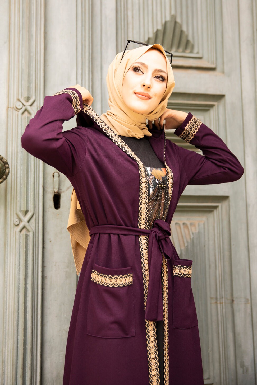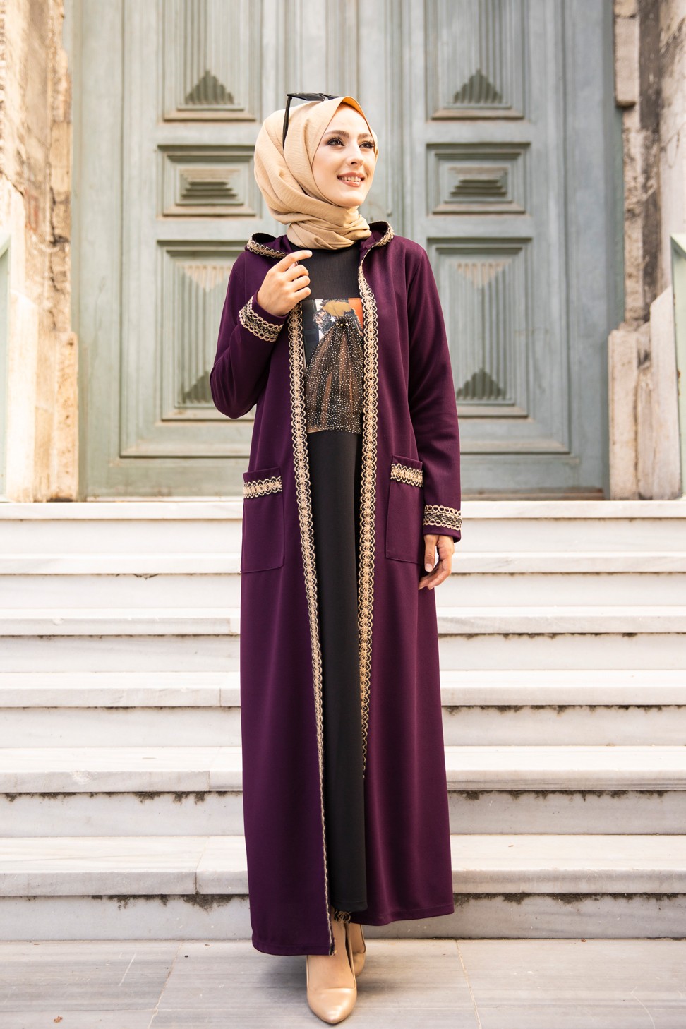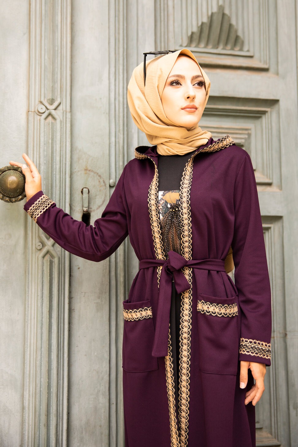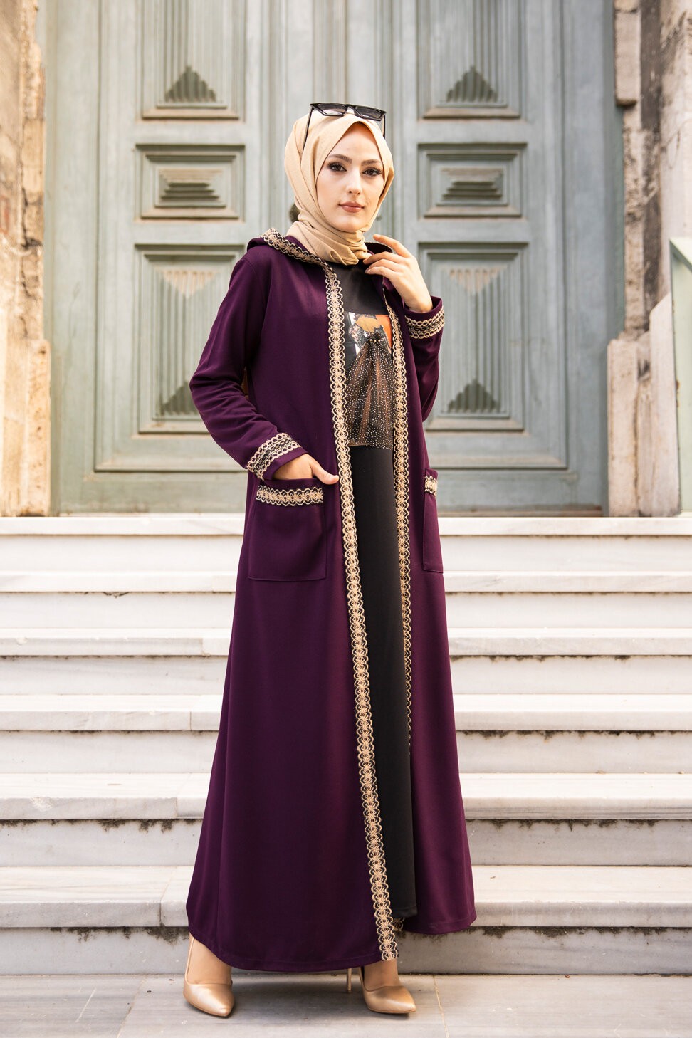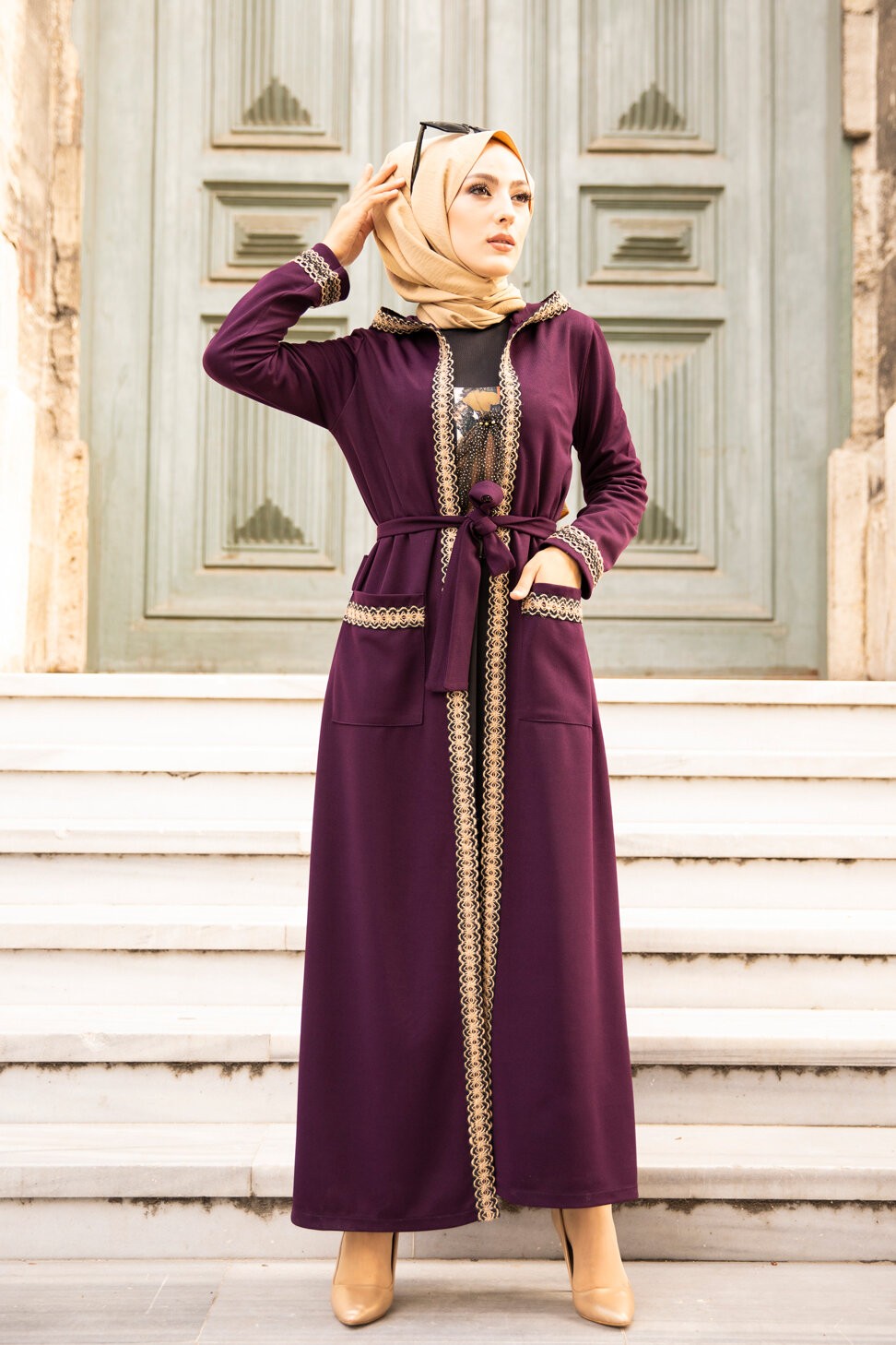 Ensemble robe et Kimono a capuche (Mode musulmane) - Couleur prune