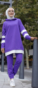 Survêtement femme deux pièces bicolore à capuche (Ensemble sport hijab pas cher) - Couleur violet avec bandes blanches - REF. 35200 (19.90 €)