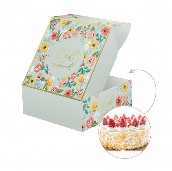 Boite a gateaux a fleurs Eid mubarak (ecriture et bordure doree) - 30 x 30 x 9,5 cm - Couleur vert amande