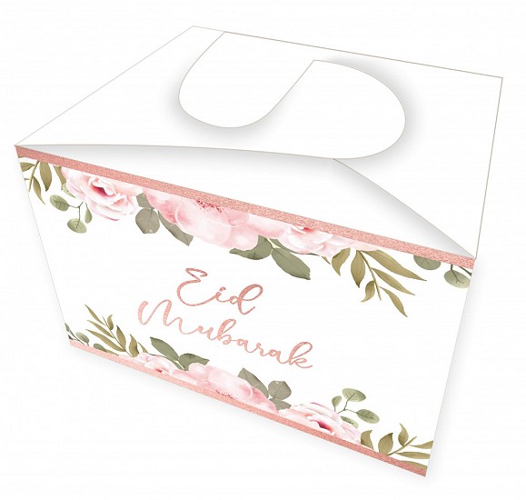Grande Boîte à gâteaux avec inscription "Eid mubarak" (Aïd Moubarak) - Couleur Blanc fleuri et rose doré - REF. 35144 (3.90 €)