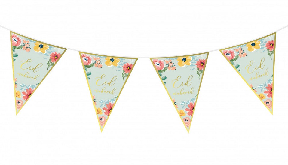 Guirlande Drapeaux à fleurs Eid Mubarak - Longueur 5 mètres et 16 fanions (Pour la fête de l'Aïd) - Couleur vert amande doré - REF. 35142 (4.90 €) - En Promotion à 3.90 €