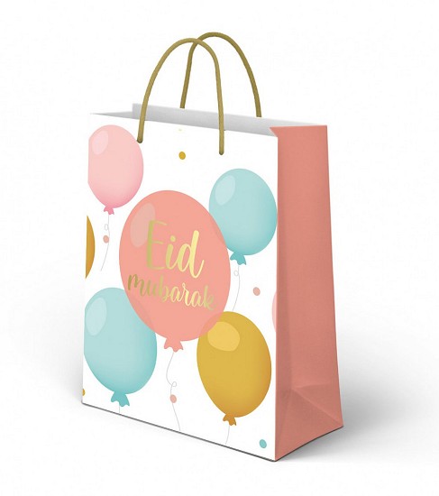 Grand Sac cadeau en carton renforce avec motifs ballons et inscription doree "Eid Mubarak" (Special fete de l'Aid)