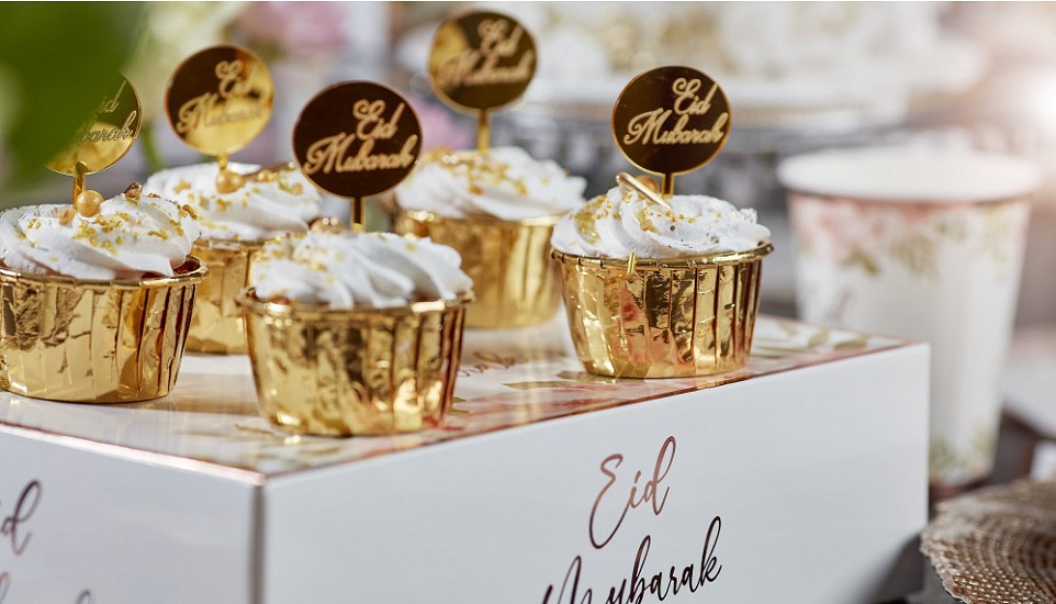 Piques à gâteau inscription Eid Mubarak (pour la fête de l'Aïd) - Couleur rose doré (8 pièces) - REF. 35156 (4.90 €) - En Promotion à 3.50 €