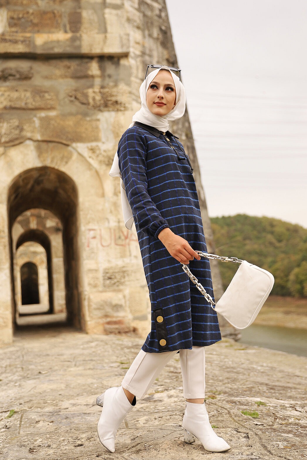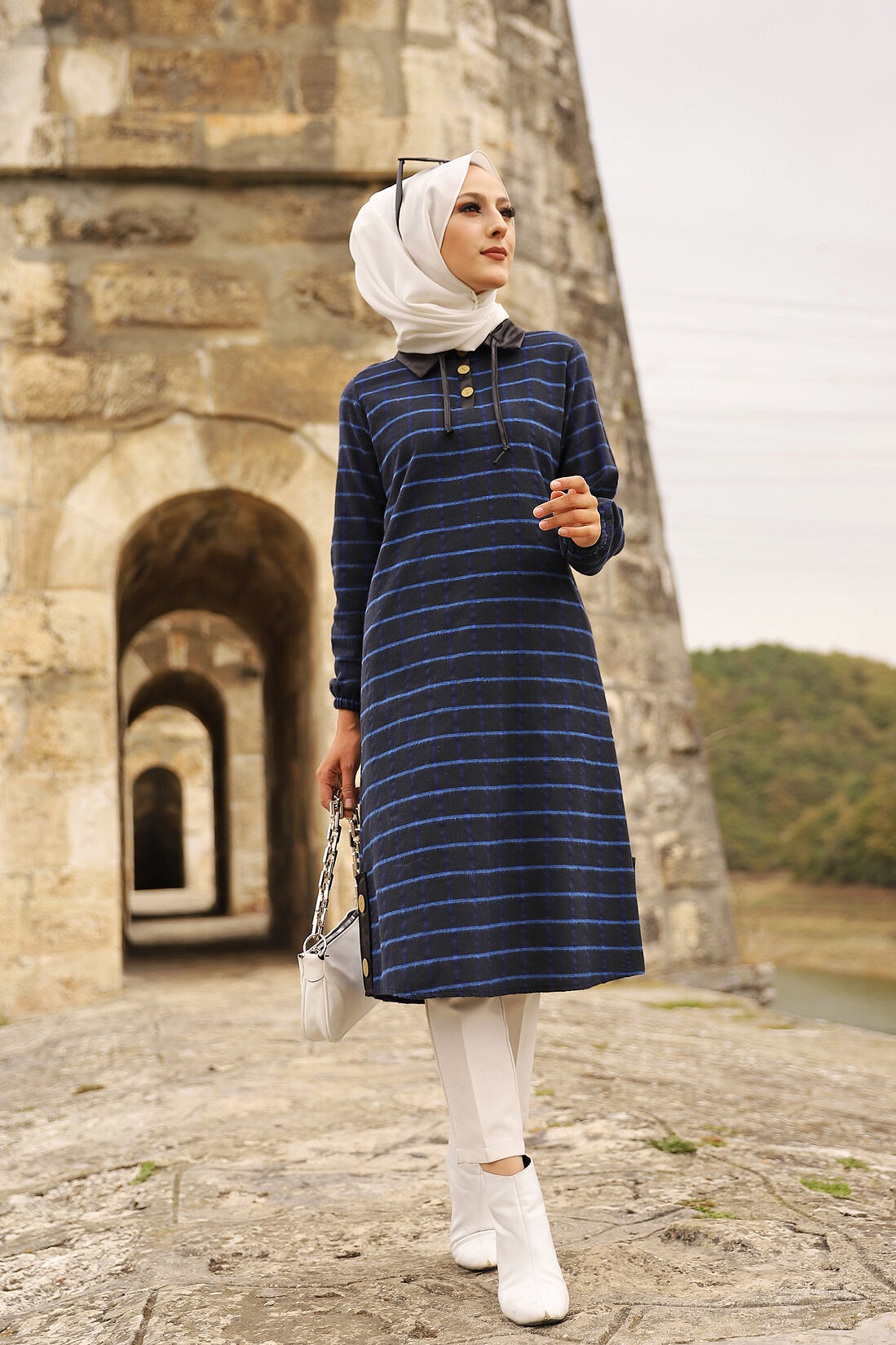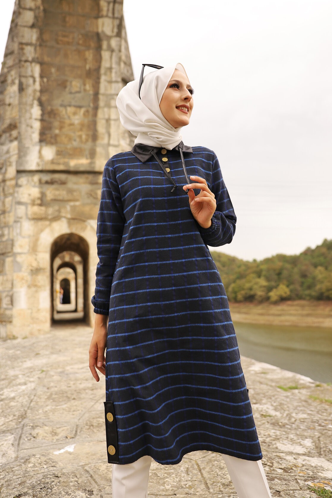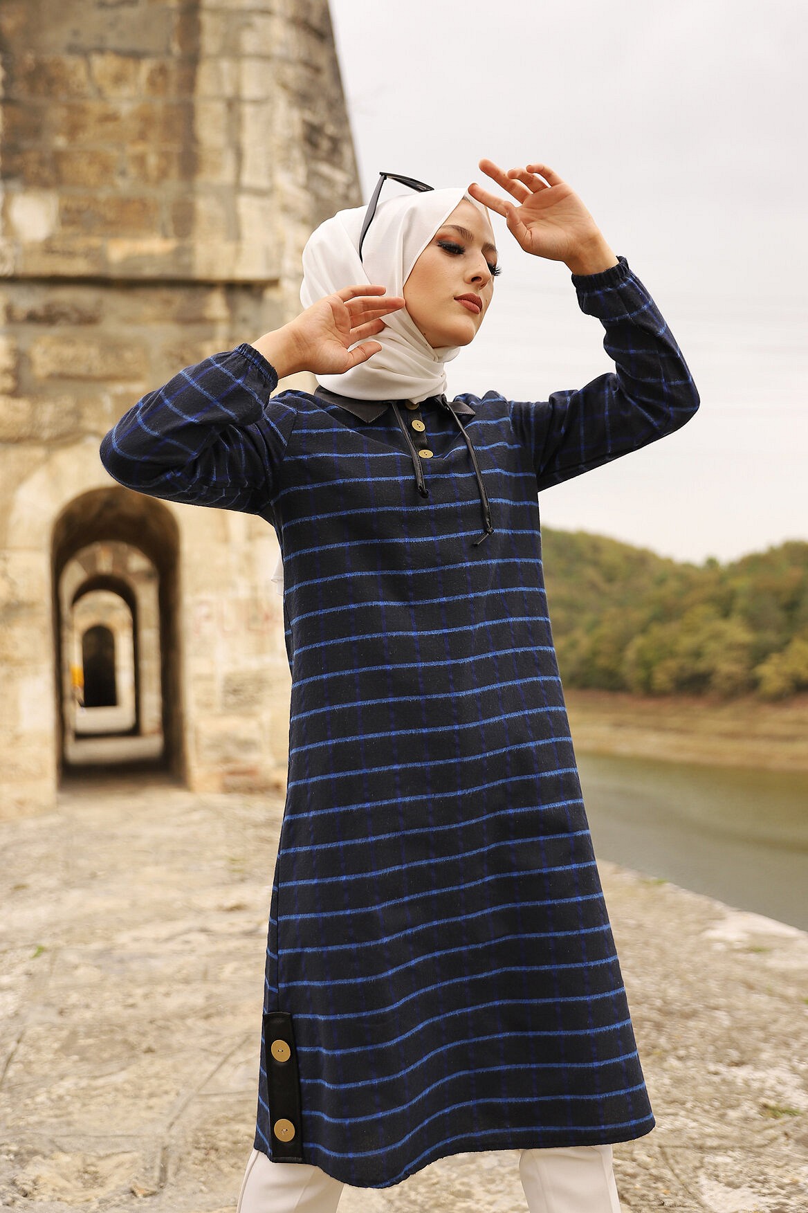 Tunique longue a rayures (Vetement hijab) - Couleur noir et bleu