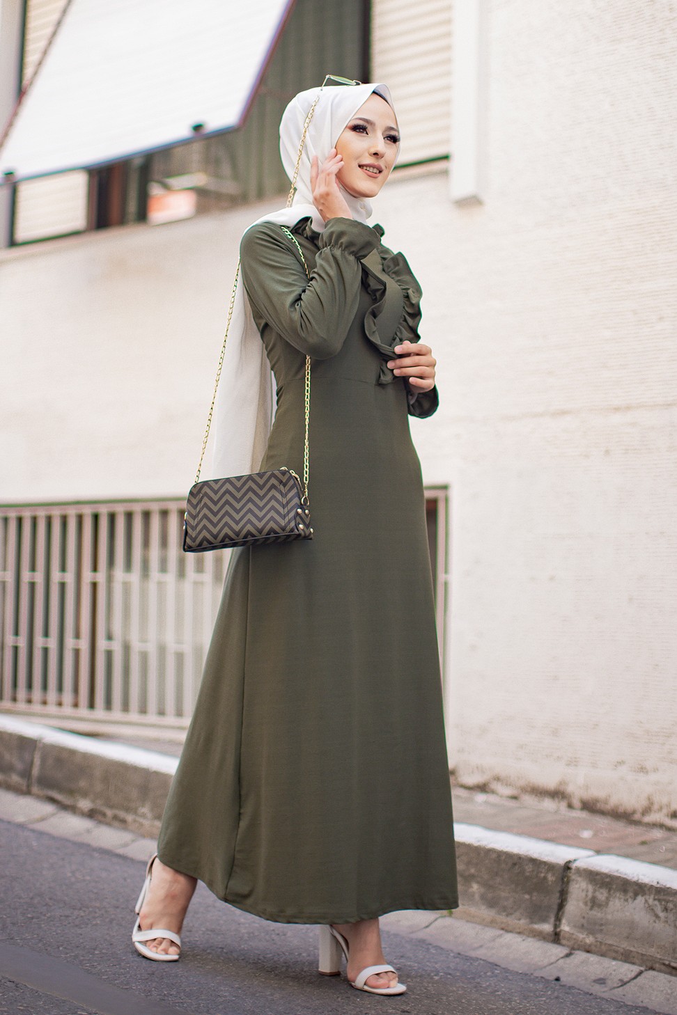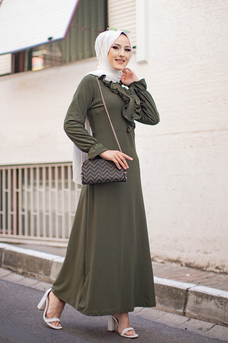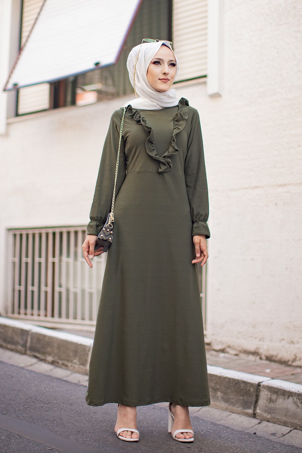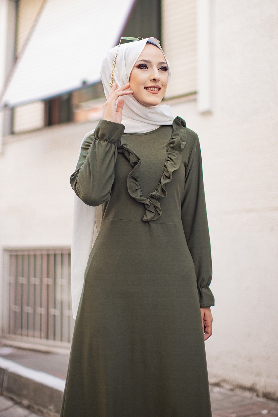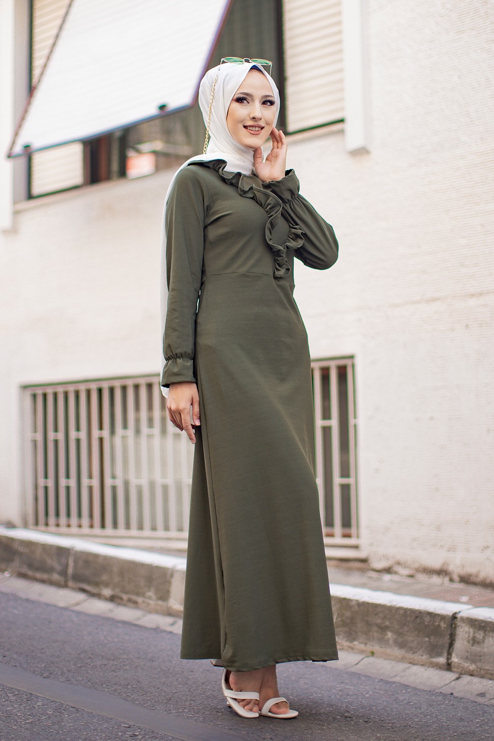 Robe longue bordée d’un volant pour femme (Vêtement style habillé pour hijab) - Couleur kaki Vetement & Accessoire