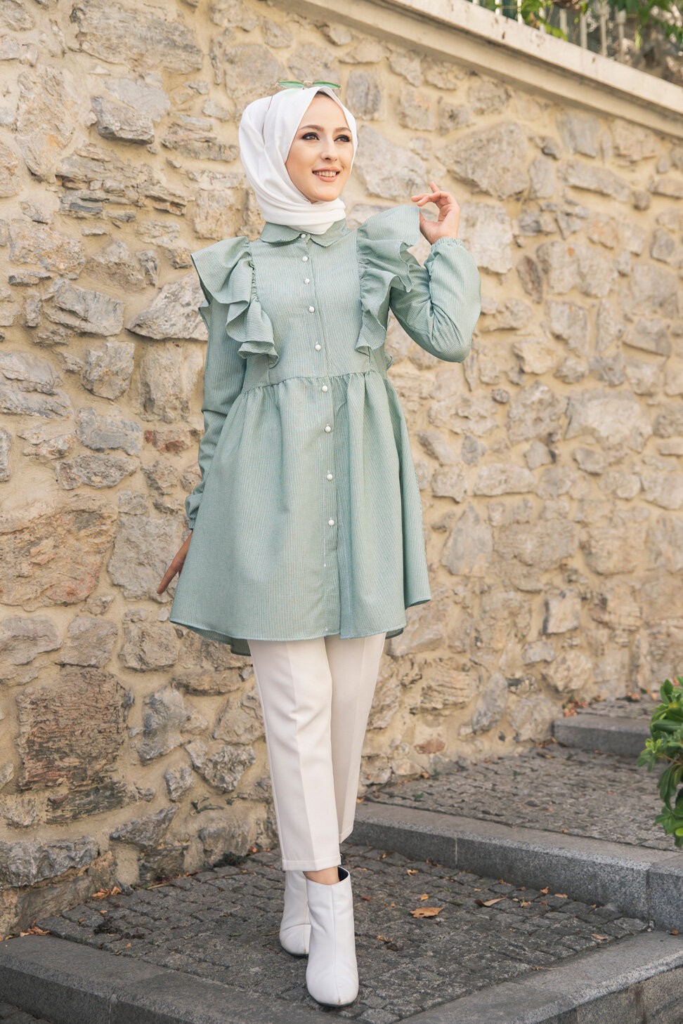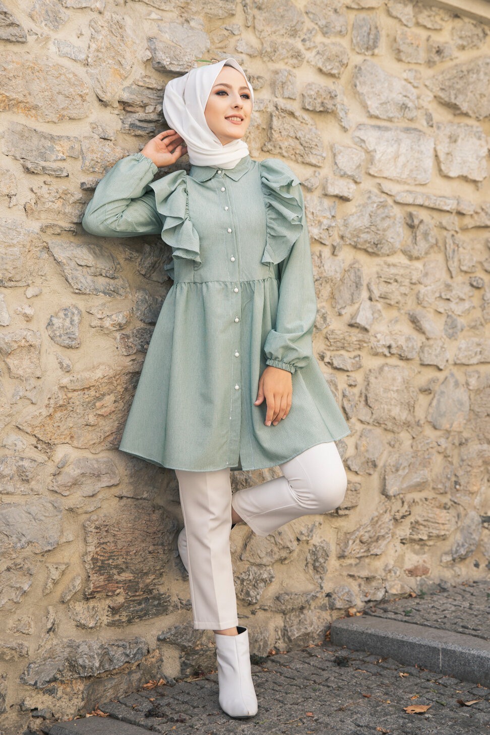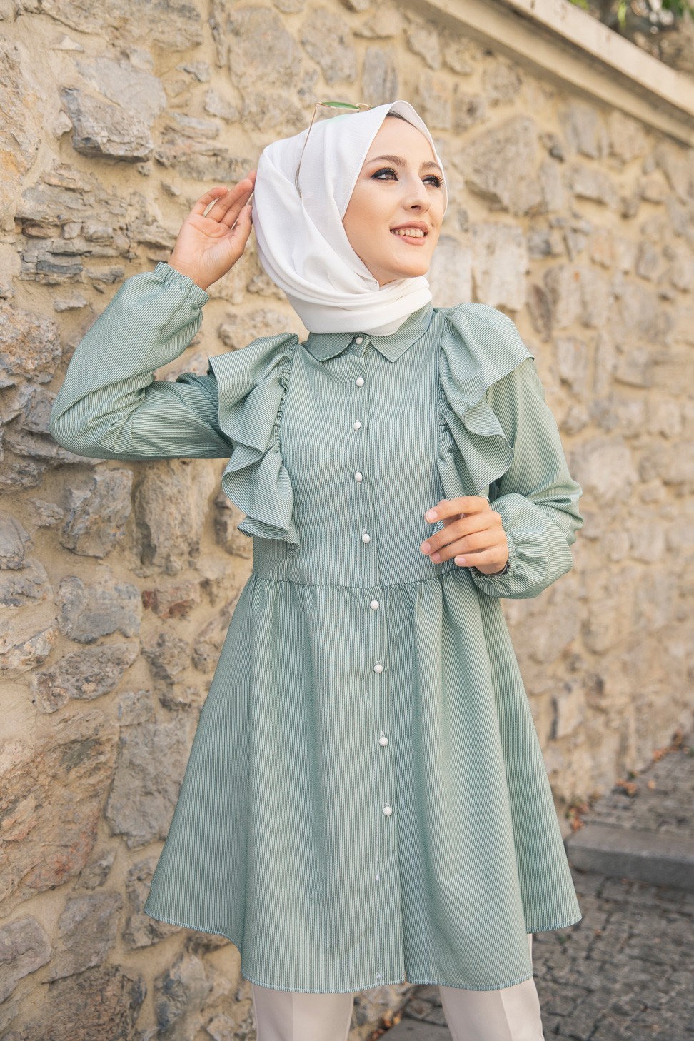 Tunique-chemise à volants ample pour femme (Vêtements pour Hijabs - Nouveautés) - Couleur des rayures vert et blanc Vetement & Accessoire