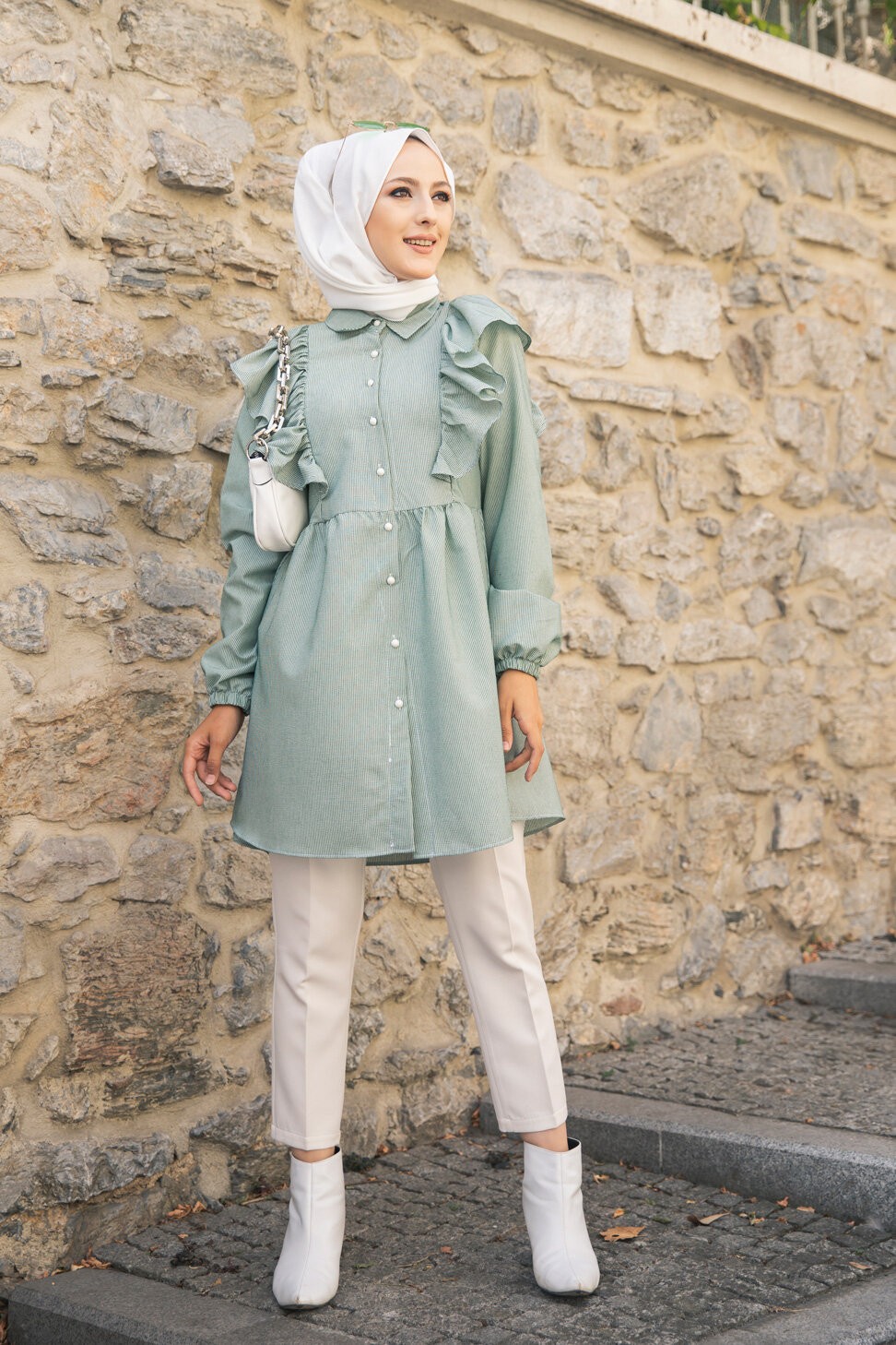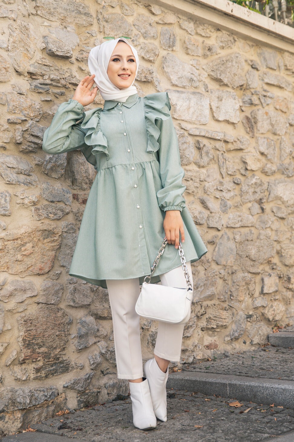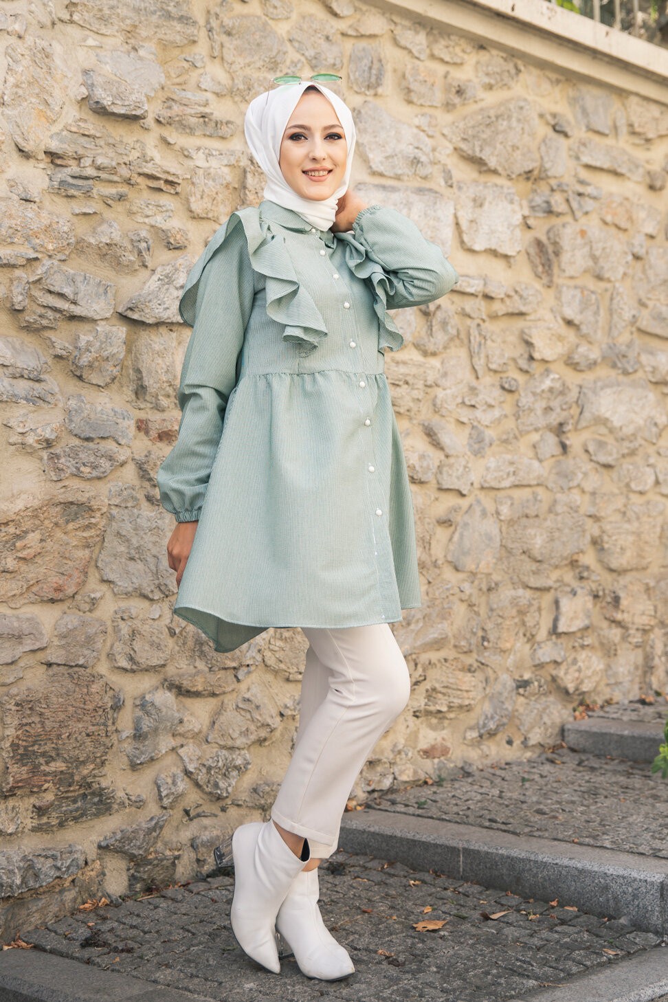 Tunique-chemise à volants ample pour femme (Vêtements pour Hijabs - Nouveautés) - Couleur des rayures vert et blanc Vetement & Accessoire
