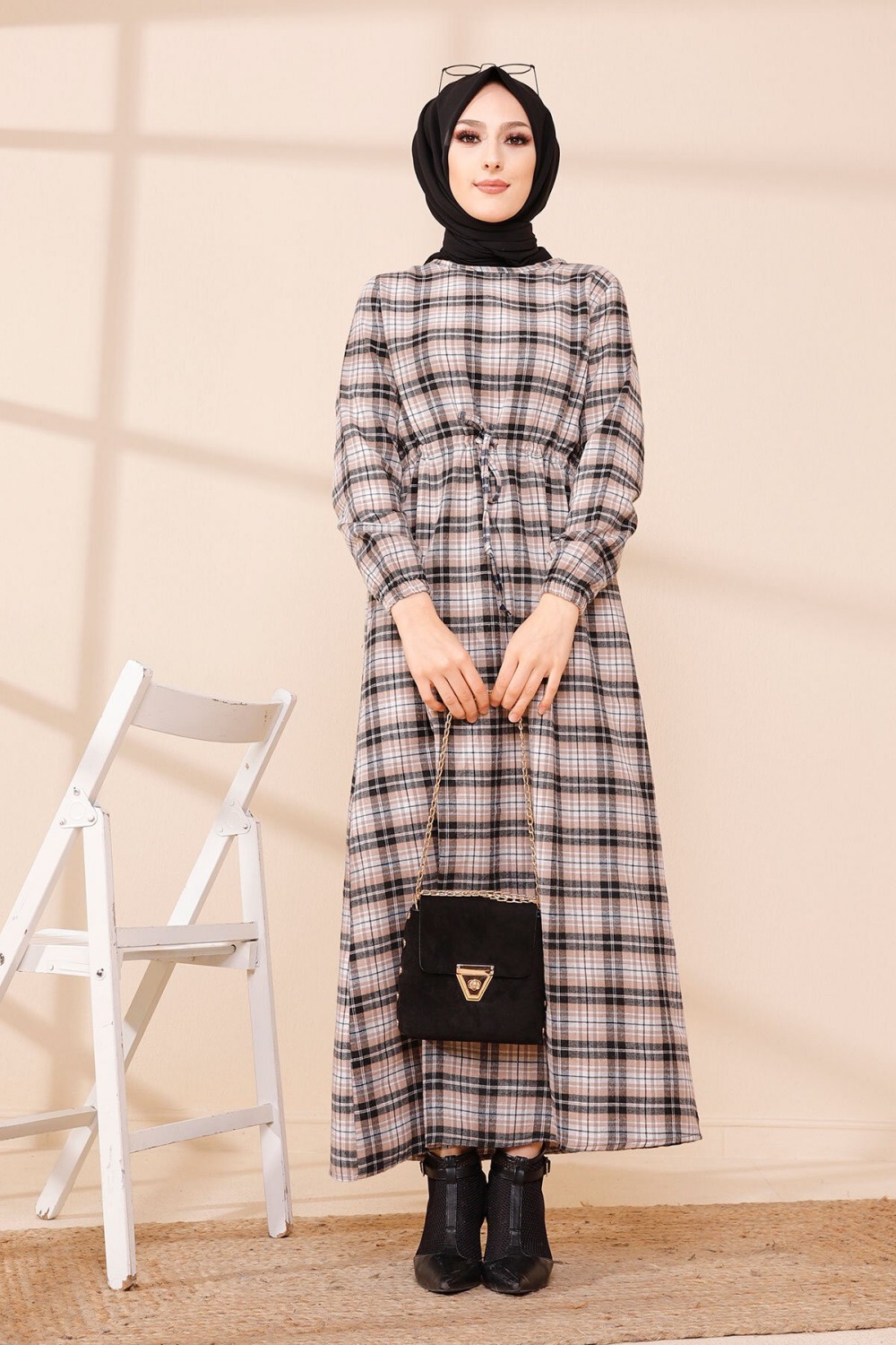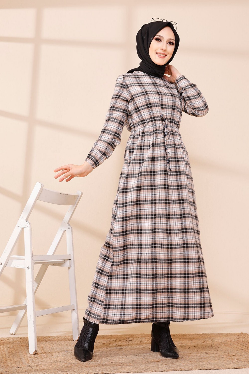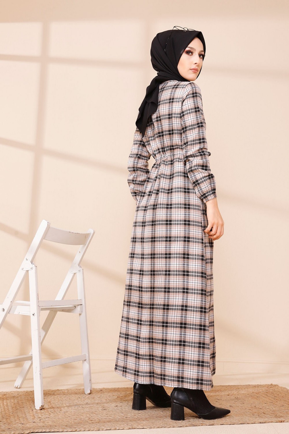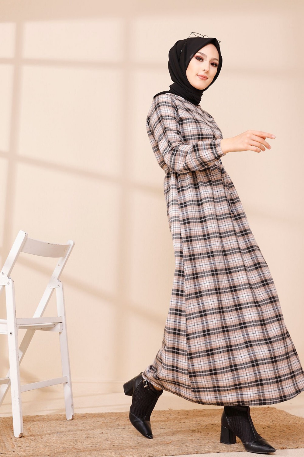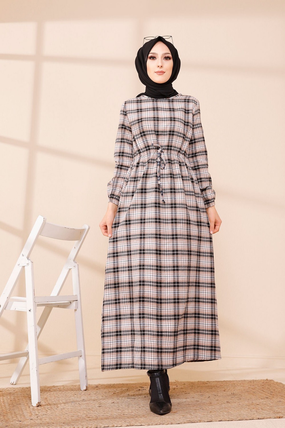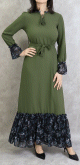 Robe-manteau boutonnée avec grandes poches et capuche (Vêtement mastour pour hijab) - Couleur kaki - REF. 36373 (29.90 €)