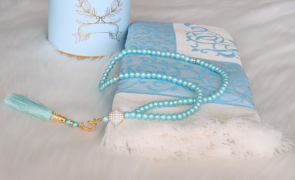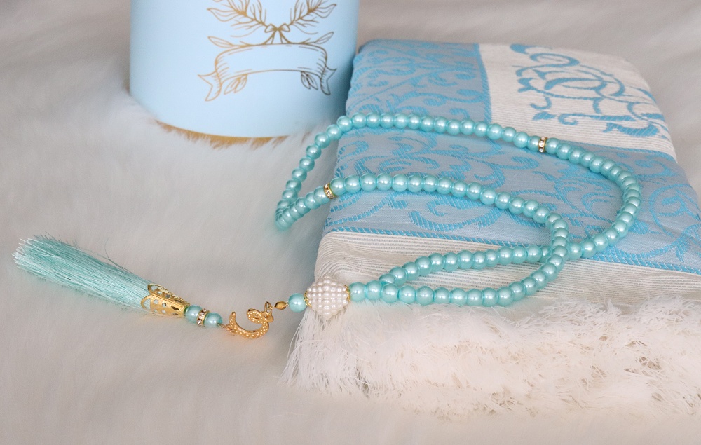Cadeau Musulman de luxe : Coran chapelet tapis assortis de couleur bleu ciel (mixte pour femme et homme) - REF. 39333 (35.00 €) - En Promotion à 29.90 €