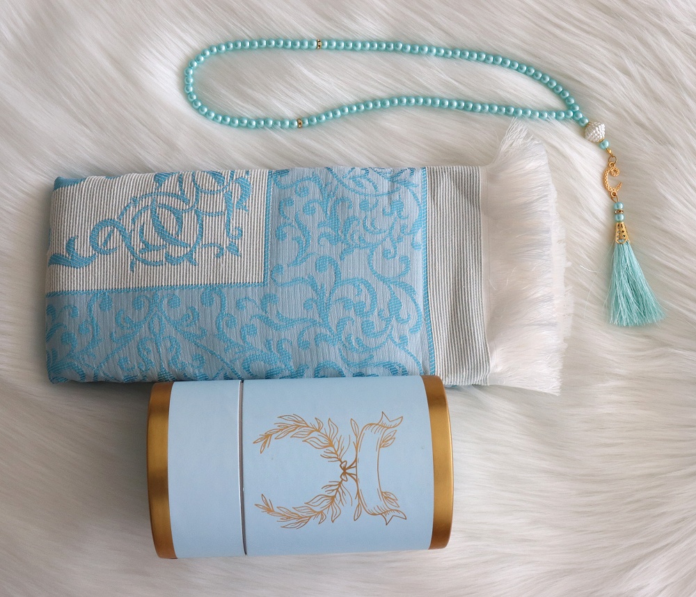 Coffret Cadeau "Ramadan Kareem" : Boite cadeau avec Tapis et Sebha deluxe assorti - Couleur Bleu ciel doré - REF. 39328 (14.90 €)