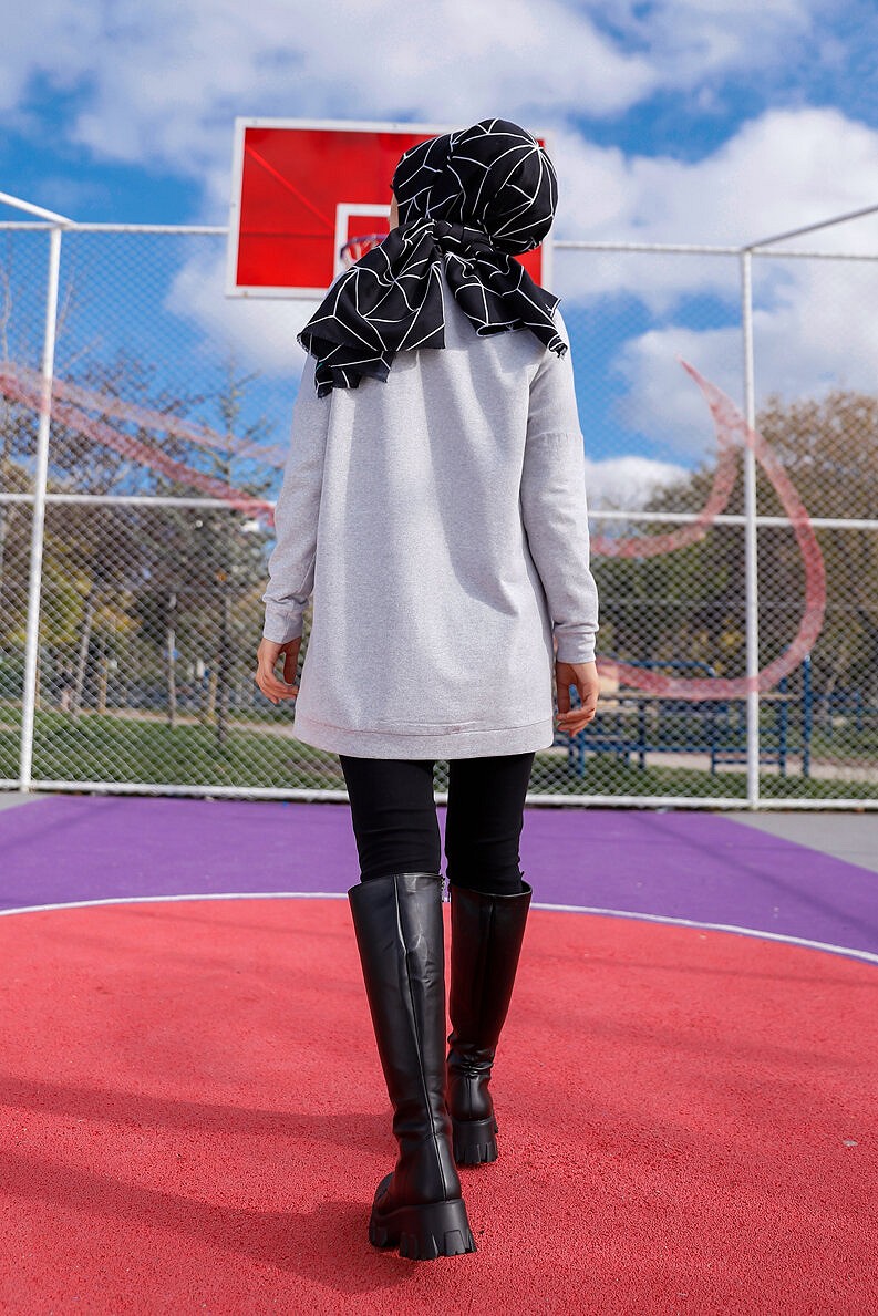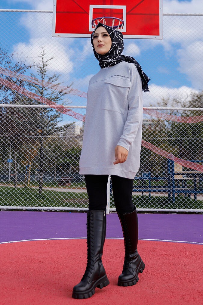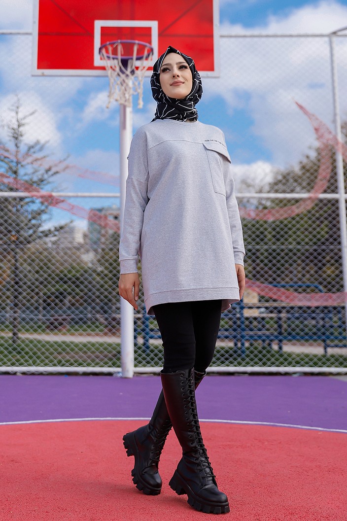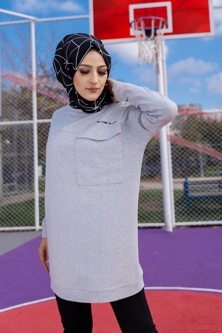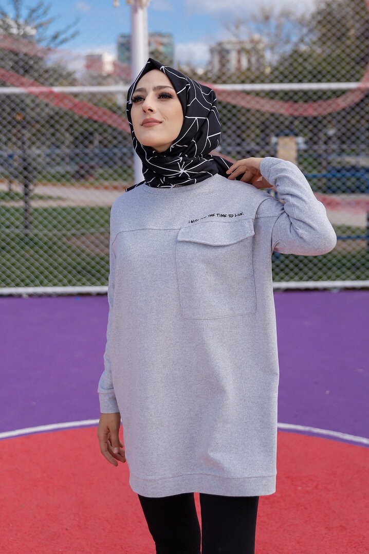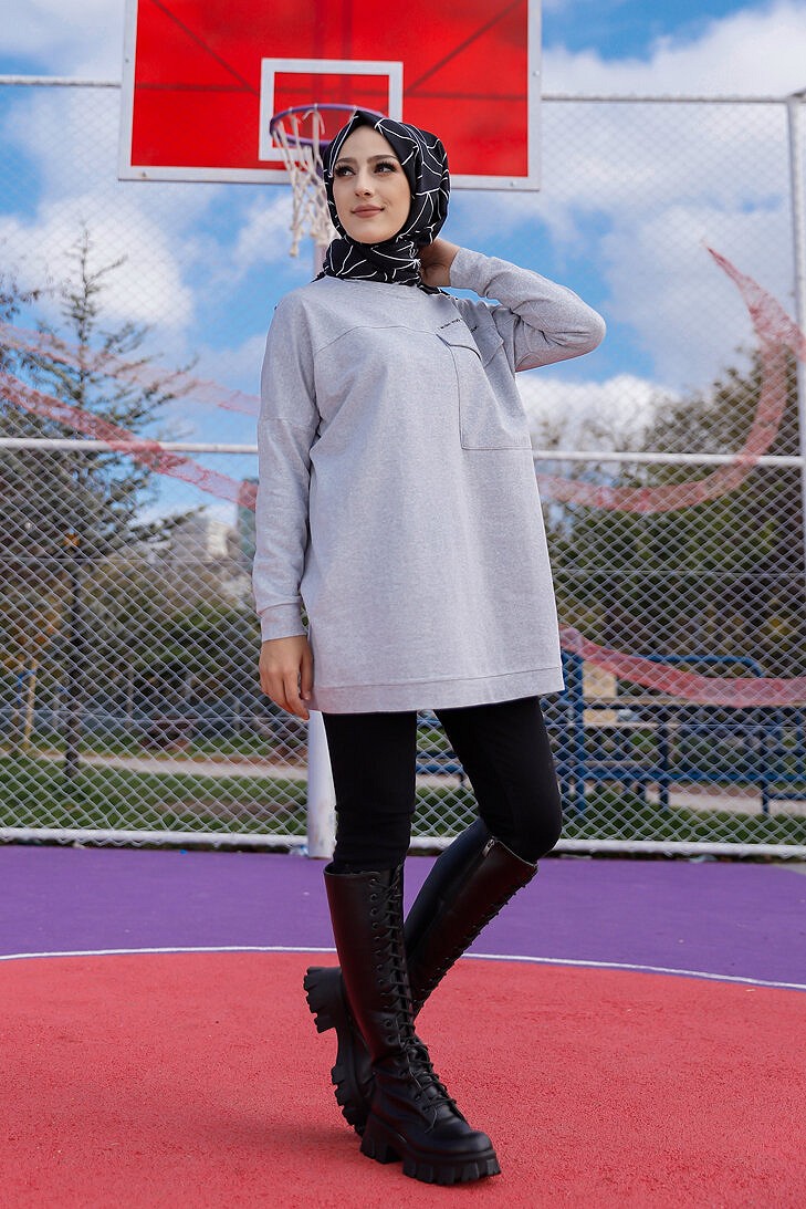 Tunique decontractee ample avec grande poche (Sweat-shirt femme - Modest Fashion) - Couleur gris clair