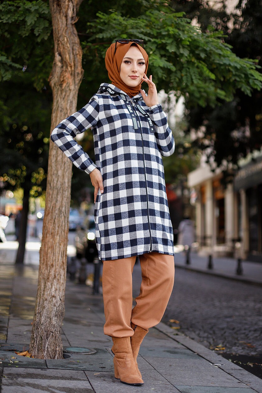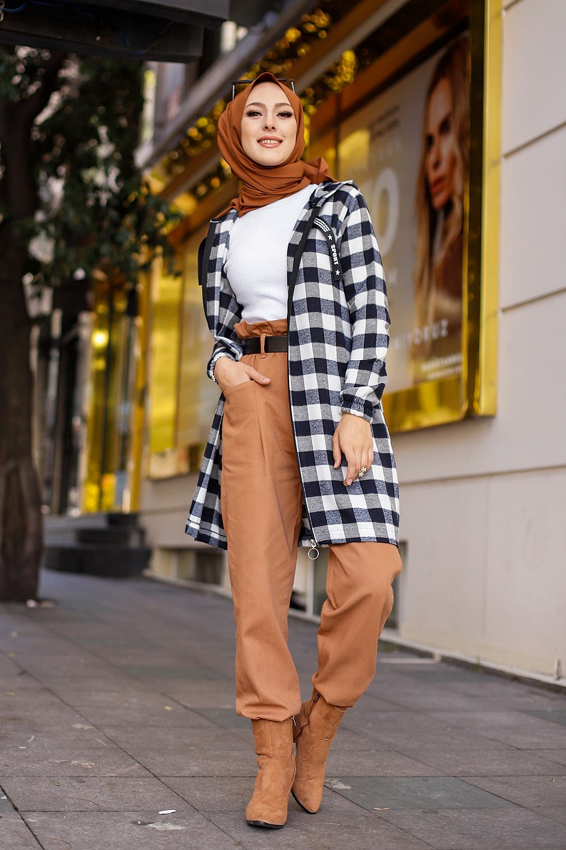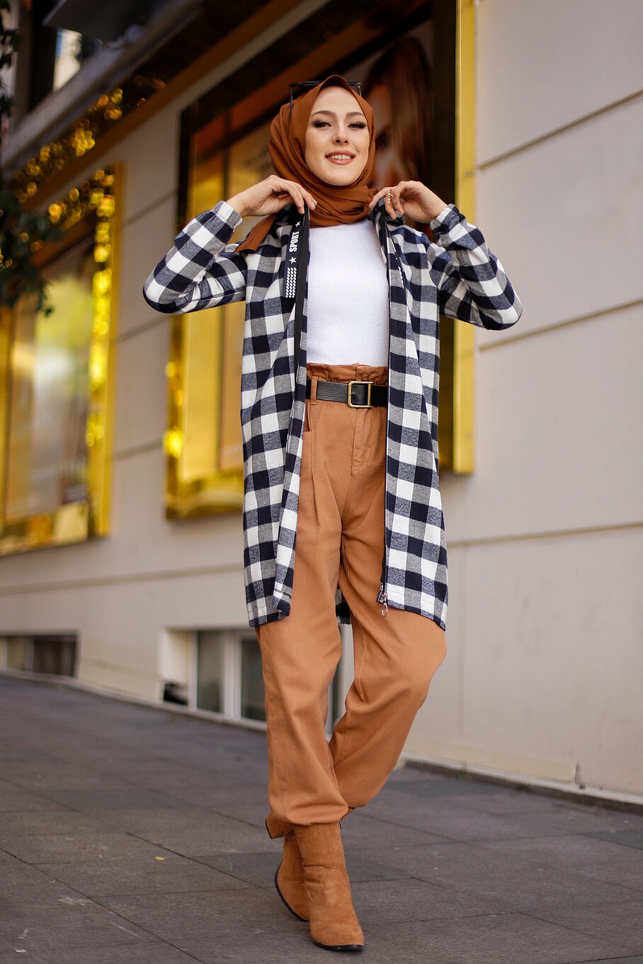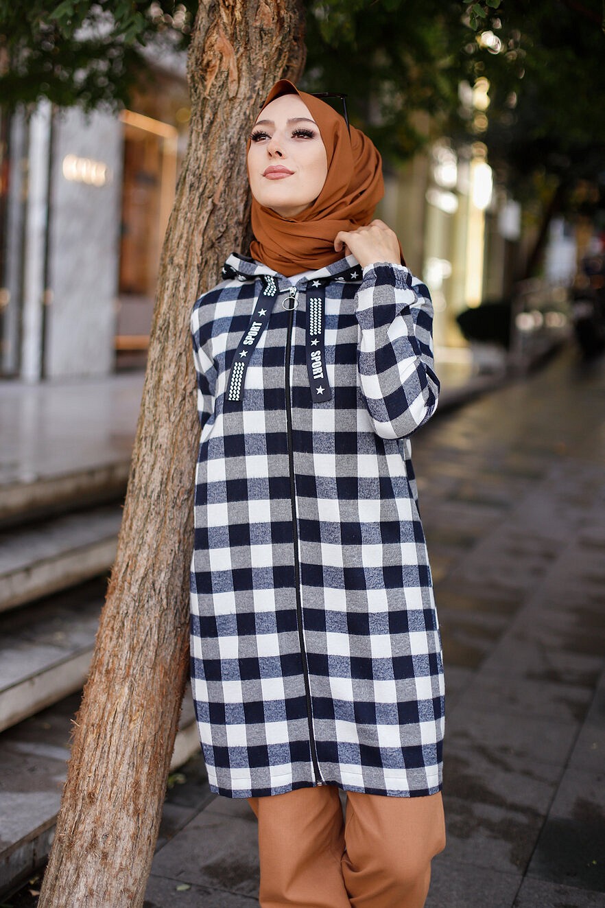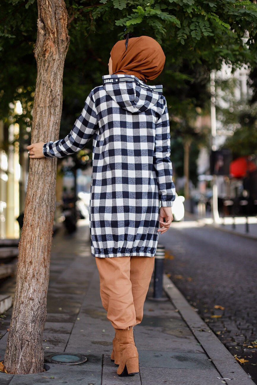 Veste-Tunique à carreaux (Tenue Hijab Hiver) - Couleur blanc et kaki - REF. 35671 (24.90 €)