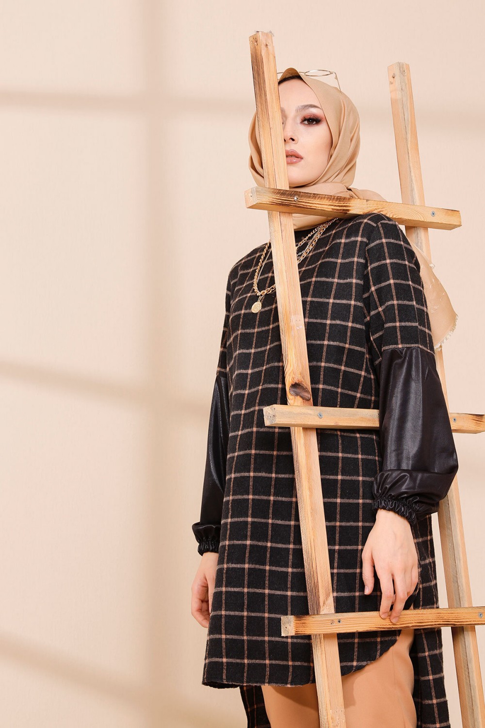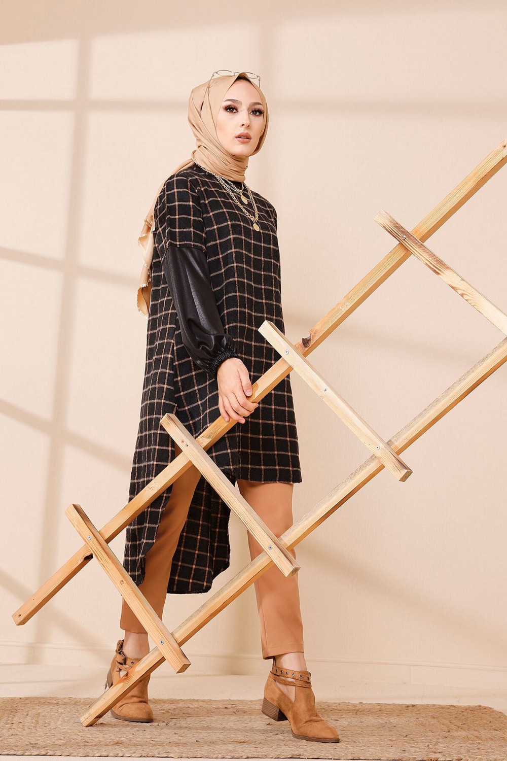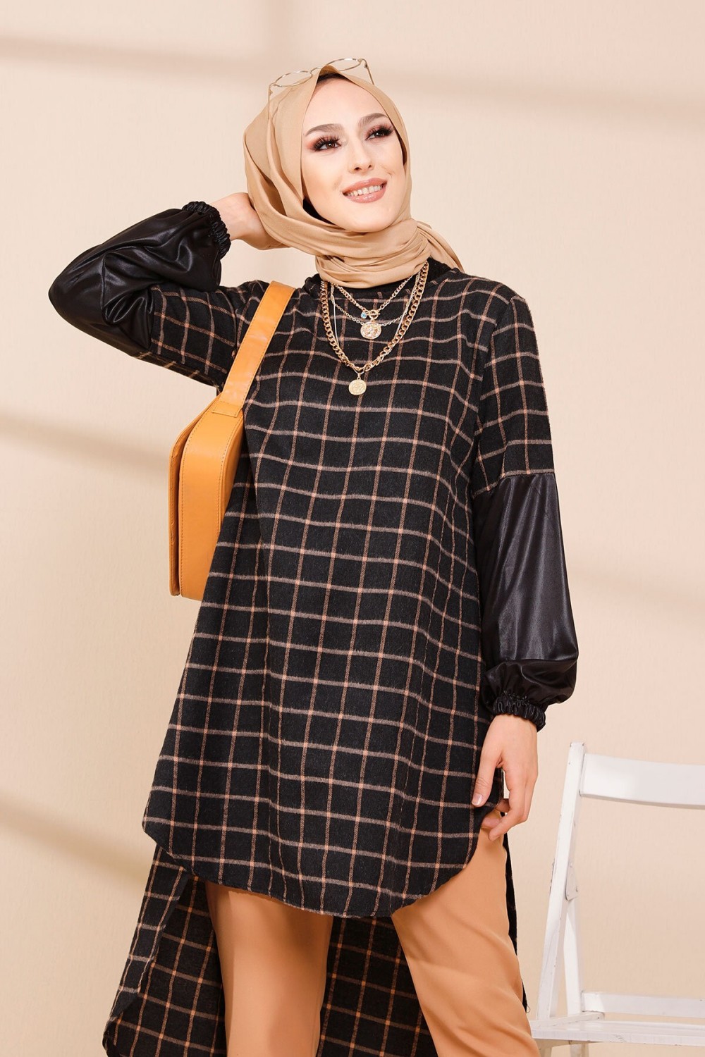 Tunique à carreaux pour femme (Modest Fashion France - Mode modeste) - Couleur bleu et tabac - REF. 35179 (25.00 €)