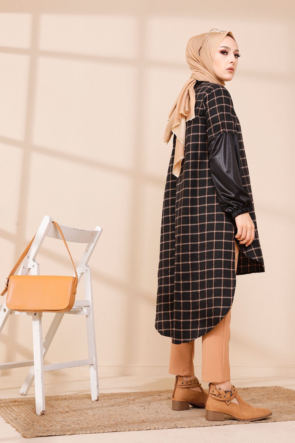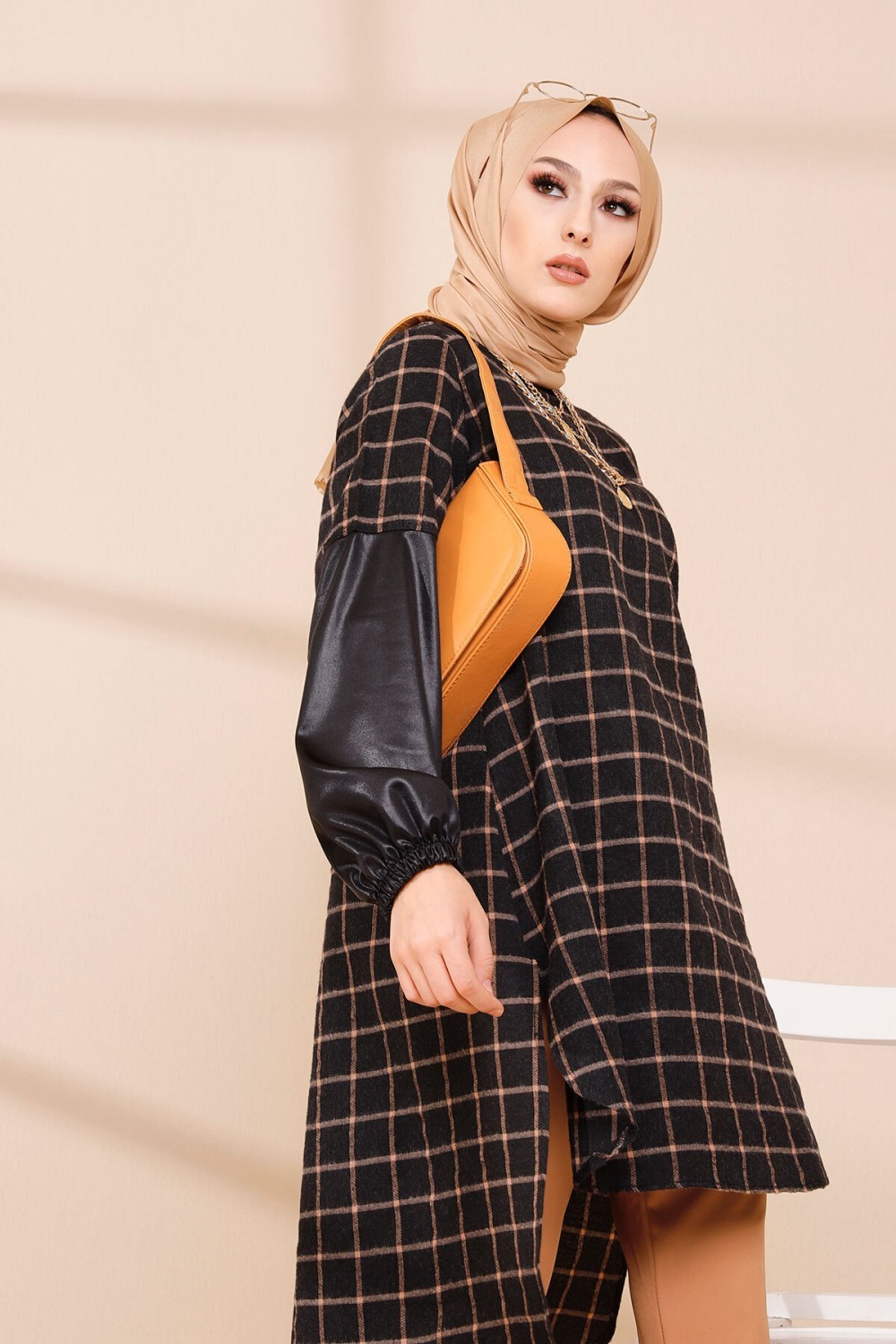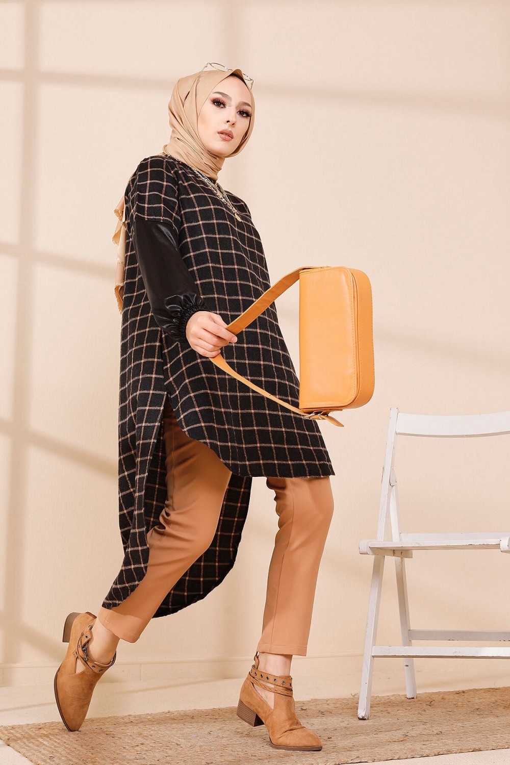 Tunique à carreaux pour femme (Modest Fashion France - Mode modeste) - Couleur bleu et tabac - REF. 35179 (25.00 €)