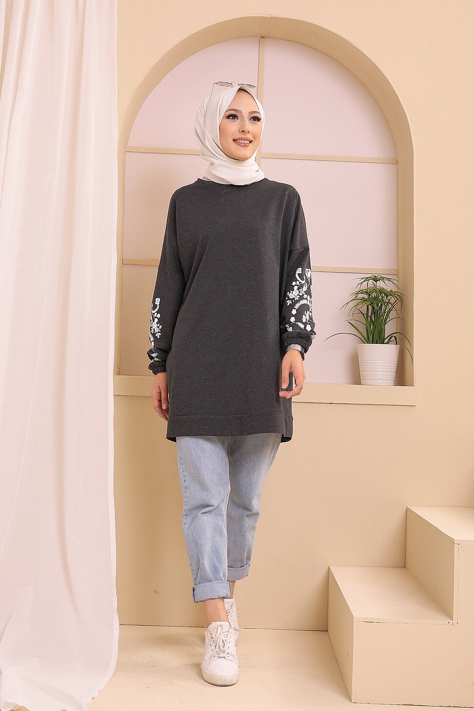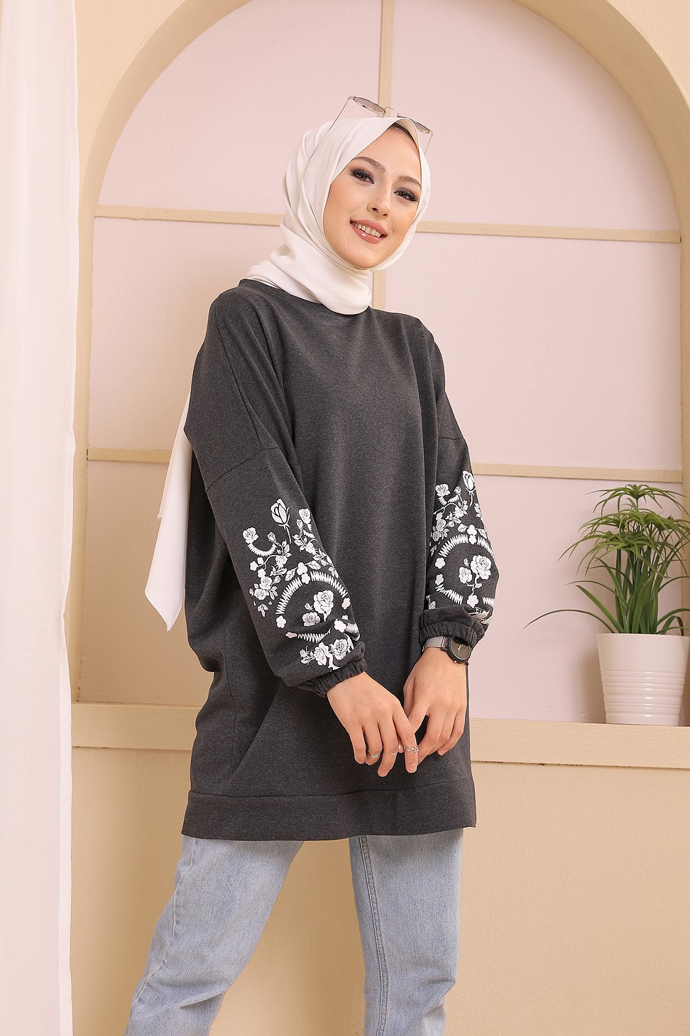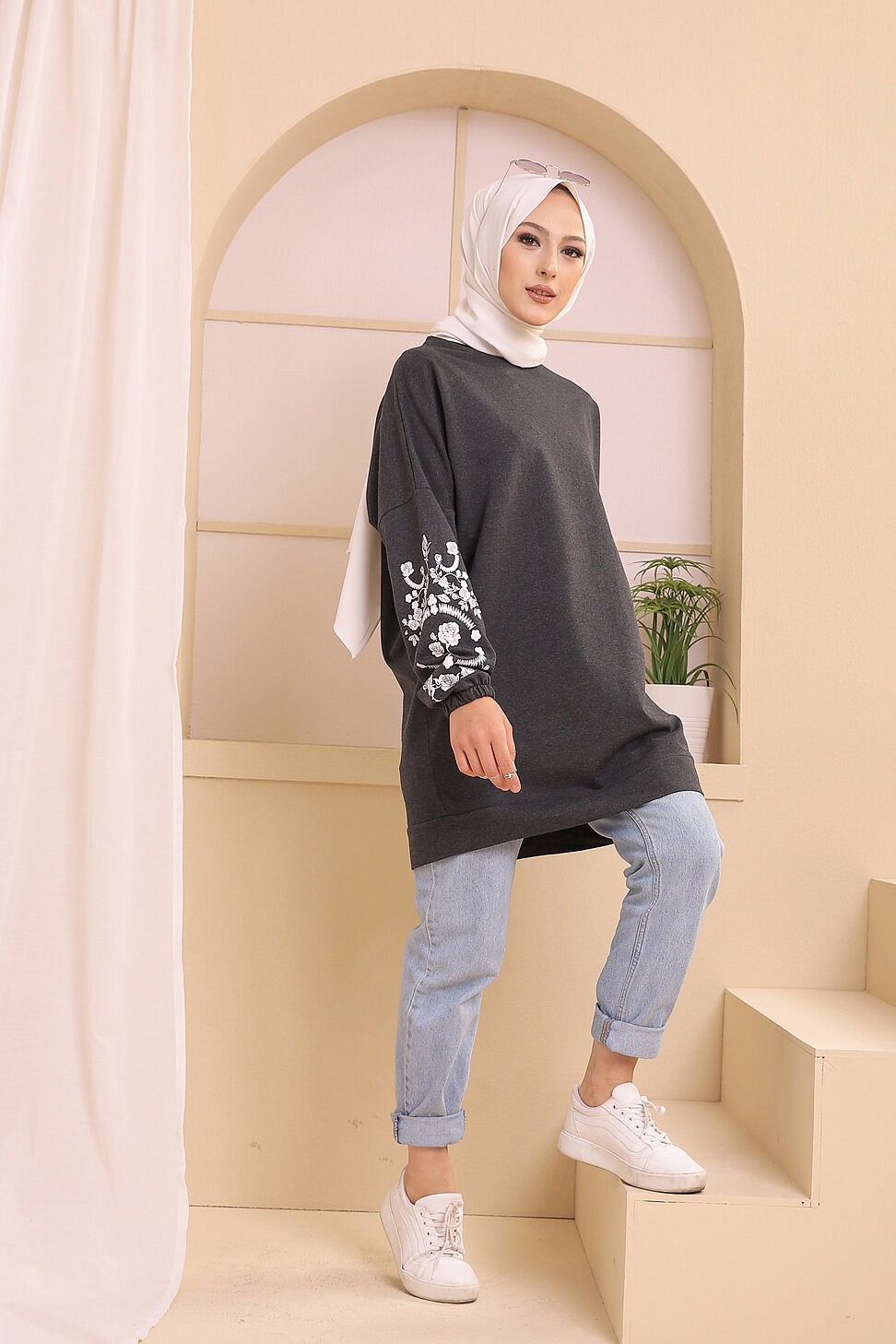 Tunique decontractee avec manches a motif fleurs (Tenue Hijab pour femme musulmane) - Couleur anthracite