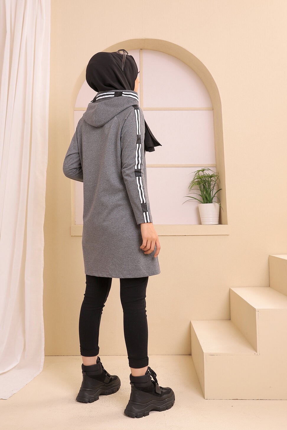 Sweatshirt long avec capuche style moderne décontracté et sport (Vêtement femme musulmane) - Couleur gris foncé Vetement & Accessoire